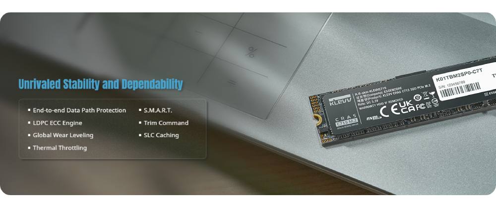 ชิป 3D NAND ที่คัดสรรมาอย่างพิถีพิถันช่วยให้ประสิทธิภาพดีขึ้นและความทนทาน CRAS C715 รุ่นมี TBW (Terabytes Written) จำนวนมาก ช่วยให้ใช้งานได้ยาวนานขึ้นเพื่อความทนทานยิ่งขึ้นและความน่าเชื่อถือ