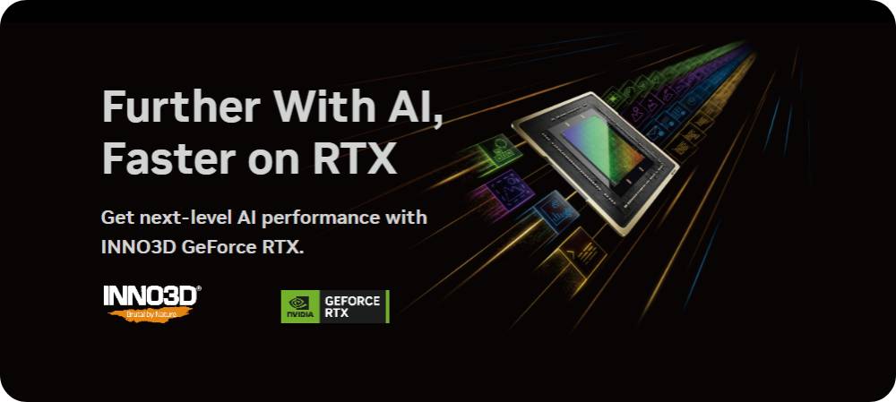 ค้นพบข้อได้เปรียบของ AI ของ RTX INNO3D GeForce RTX™ สร้างขึ้นสำหรับยุค AI โดยมี AI Tensor Cores เฉพาะทางที่มอบประสิทธิภาพที่ล้ำสมัยและ ความสามารถระดับถัดไป ตั้งแต่ความคิดสร้างสรรค์ที่ปรับปรุงและ ประสิทธิภาพการทำงานที่มีประสิทธิภาพสูงสุดไปจนถึงการเล่นเกมที่รวดเร็วทันใจ พลัง AI สูงสุดบนพีซี Windows อยู่ที่ RTX