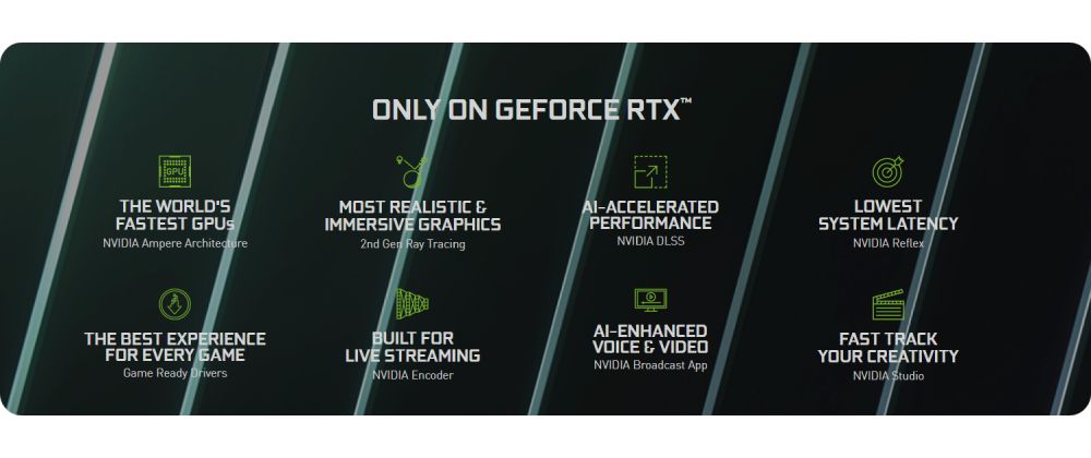 NVIDIA RTX™ เป็นแพลตฟอร์มที่ล้ำหน้าที่สุดสำหรับเทคโนโลยีเรย์เทรซิงและ AI ซึ่งกำลังปฏิวัติวิธีการเล่นและสร้างสรรค์ของเรา เกมและแอปพลิเคชันชั้นนำกว่า 150 รายการใช้ RTX™ เพื่อมอบกราฟิกที่สมจริงพร้อมประสิทธิภาพที่รวดเร็วอย่างเหลือเชื่อหรือคุณสมบัติ AI ใหม่ที่ล้ำสมัย เช่น NVIDIA DLSS และ NVIDIA Broadcast RTX™ คือมาตรฐานใหม่