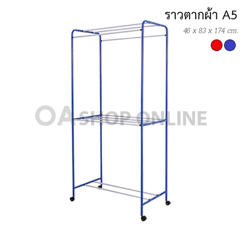 ราวตากผ้าเหล็ก No.A5 ผลิตจากแป็ปเฟอร์นเจอร์ พ่นสีฝุ่นอิพ๊อคซี่ อบด้วยความร้อนที่อุณหภูมิ 200 องศา เคลือบป้องกันสนิมด้วยระบบซิงก์ฟอสเฟตปลายขามีลูกล้อพลาสติก ขนาด : 46 x 83 x 174 cm. สี : แดง และน้ำเงิน