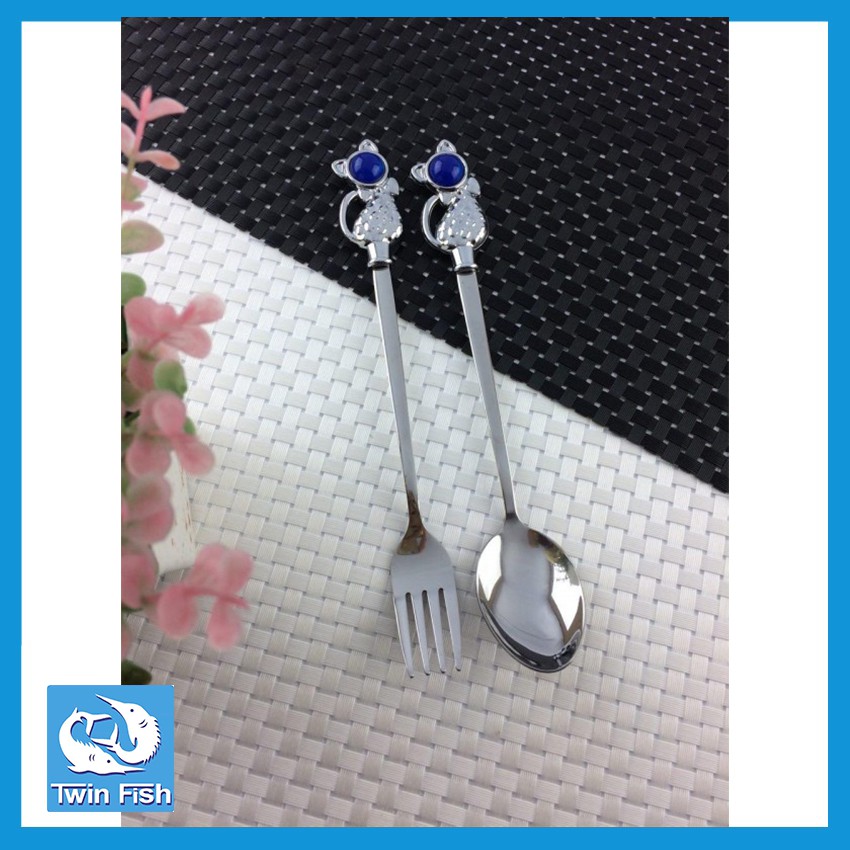 Twin Fish ช้อนส้อมสเตนเลส ปลายด้ามแมว สีน้ำเงิน Twin Fish รหัสCOL-1