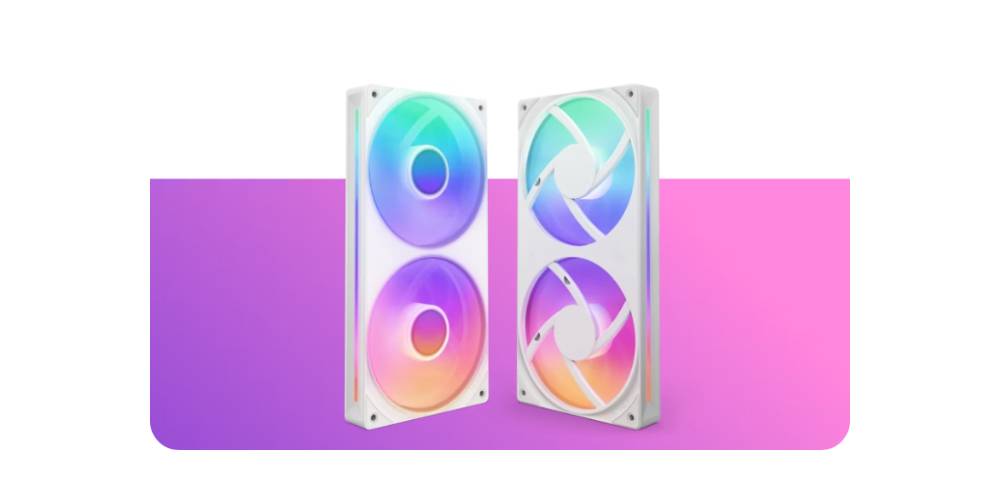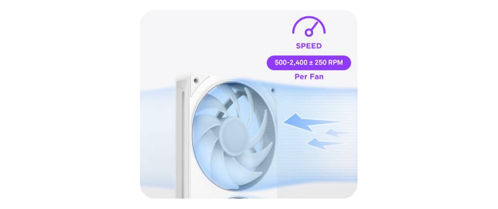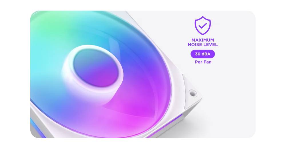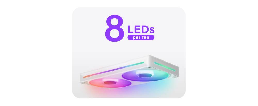 - ไฟ LED RGB จำนวน 8 ดวงที่สามารถระบุตำแหน่งได้แยกกันต่อฮับพัดลมหนึ่งตัวจะกระจายไปทั่วใบพัดแบบโปร่งแสงเพื่อภาพที่มีสีสันสดใส