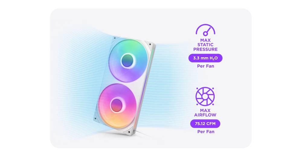 - ควบคุมแสงและความเร็วพัดลมผ่านซอฟต์แวร์ CAM เมื่อเชื่อมต่อกับตัวควบคุม NZXT (จำหน่ายแยกต่างหาก)