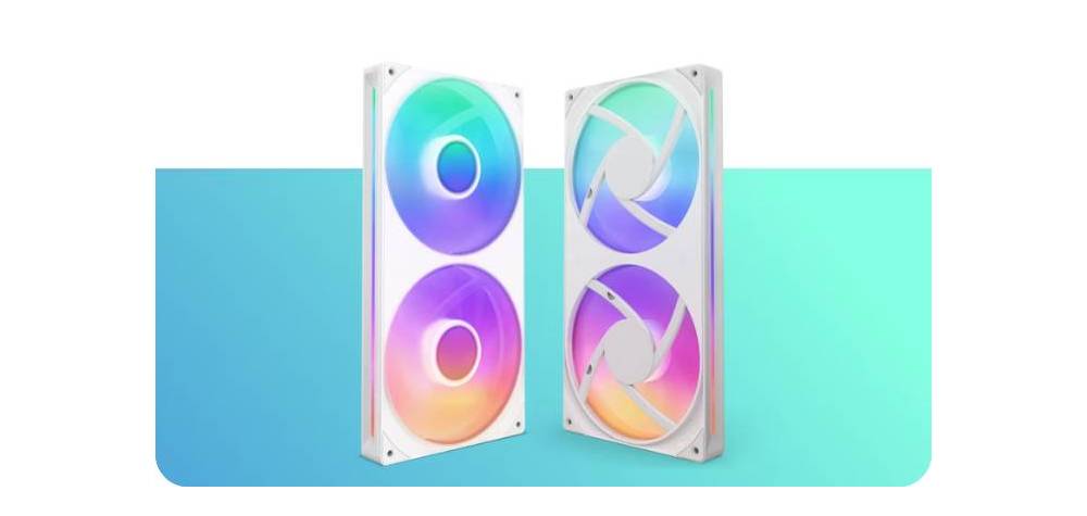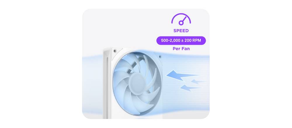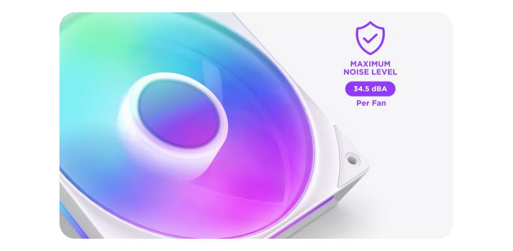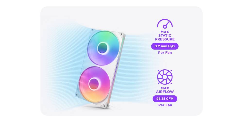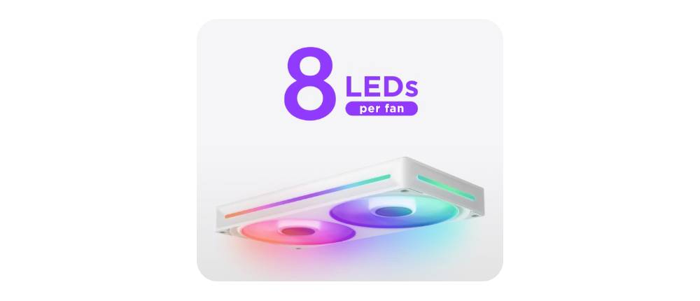 - ไฟ LED RGB จำนวน 8 ดวงที่สามารถระบุตำแหน่งได้แยกกันต่อฮับพัดลมหนึ่งตัวจะกระจายไปทั่วใบพัดแบบโปร่งแสงเพื่อภาพที่มีสีสันสดใส