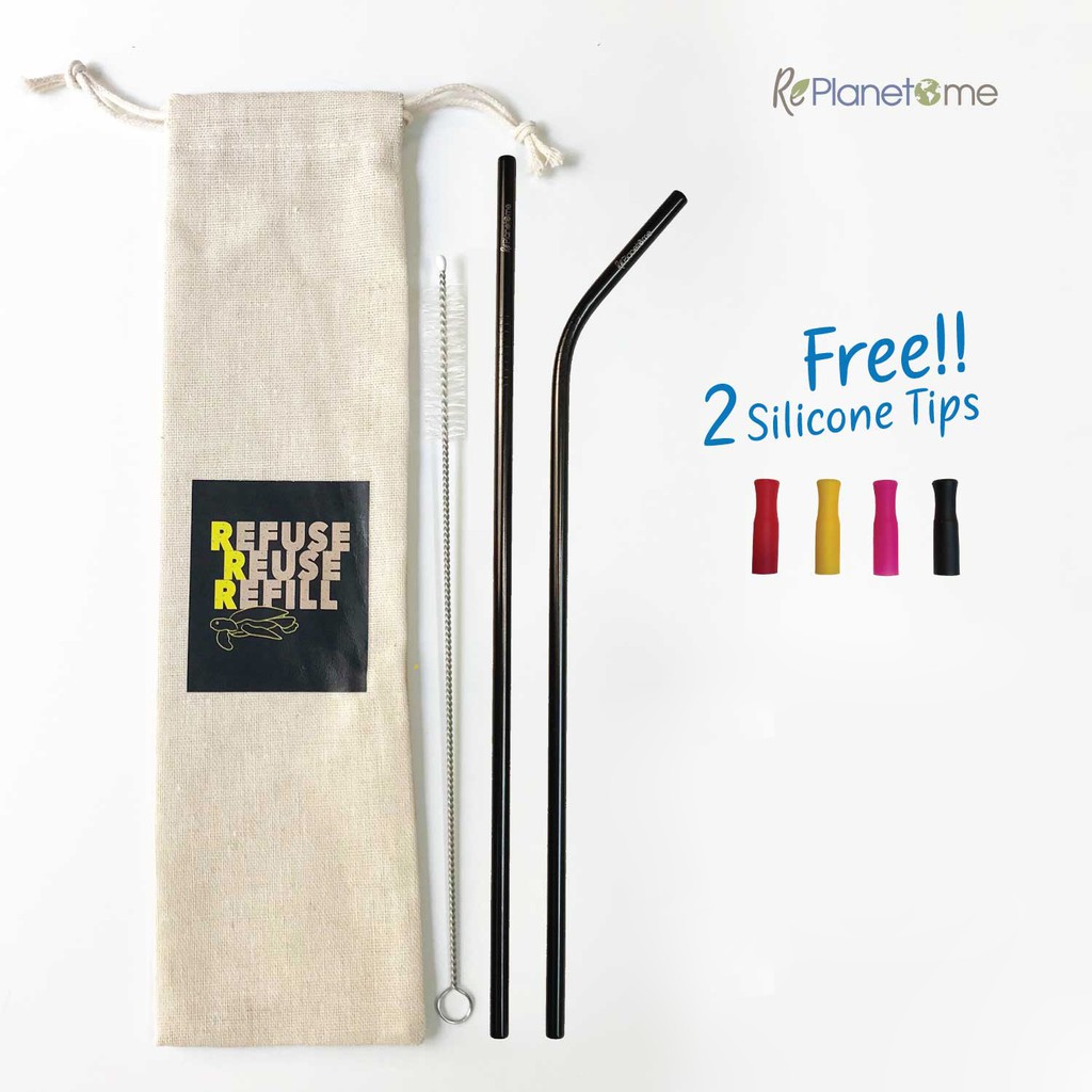 RePlanetMe หลอดสแตนเลสแท้ ขนาดแก้วเยติ 26.7 ซม. x 6 มม. (แถมฟรี ปลอกซิลิโคน + ถุงผ้าดิบ Metal YETI Tumbler Straw Set)ดำ (Black)