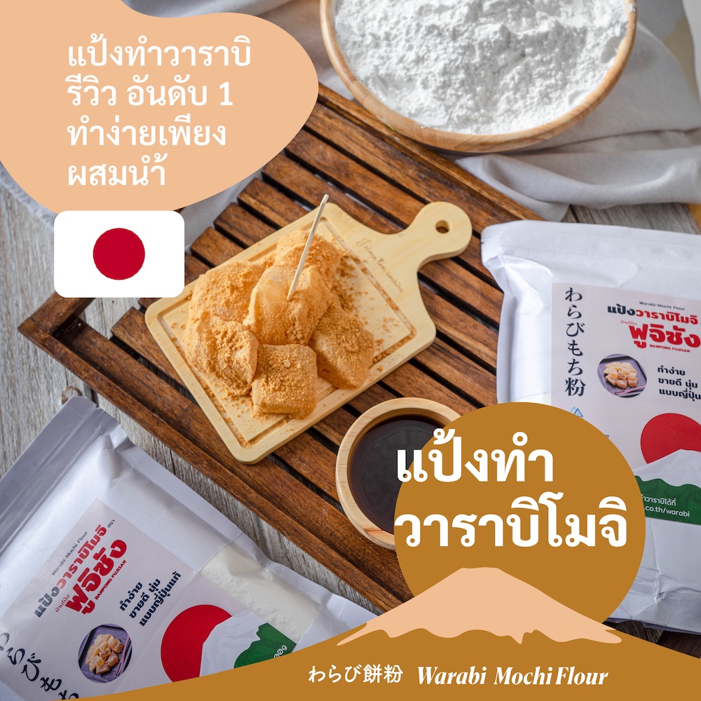 แป้งวาราบิ สำหรับทำขนมวาราบิโมจิ ขนาด 500 กรัม วาราบิโมจิ ทำง่าย อร่อยด้วย สูตรวิธีการทำวาราบิโมจิ จากแป้งวาราบิ บ้านโป่งฟูจิซังนวัตกรรมจากญี่ปุ่น ส่วนผสม : わらび餅 แป้งวาราบิโมจิ 100 กรัม (25%) นํ้าตาล 50 กรัม (9%) นํ้าเปล่า 300 มล. (66%) วิธีการทำโดย บ้านโป่งฟูจิซัง 1. ผสมส่วนผสมทั้งหมดใส่หม้อ คนให้น้าตาลและแป้งละลายเข้ากันดี 2. นำหม้อขึ้นตั้งไฟ เปิดไฟกลาง กวนน้าแป้งตลอดเวลา จนน้าแป้งเริ่มเกิดเจลใสๆบริเวณก้นหม้อ วัดอุณหภูมิได้ 60˚ 3. น้ำแป้งจะเริ่มหนึดขึ้นอย่างรวดเร็ว ให้กวนความเร็วปานกลาง ป้องกันการเกิดฟองอากาศตอนใส่ลงพิมพ์ 4. เจลจะเริ่มใสขึ้นวัดอุณหภูมิได้ 75˚ จากนั้นเริมจับเวลา 2 นาที กวนจนครบเวลา แล้ว ยกลงเทใส่ลงพิมพ์ที่รองด้วย ฟิล์มยืดห่ออาหาร เกลี่ยเจล ให้เต็มพิมพ์ และ ห่อเจลให้เรียบร้อย 5. นำลงแช่ใน น้ำเย็นจัด (น้ำ+น้าแข็ง) ทิ้งไว้ 30 นาที 6. เมื่อครบเวลา แกะออกจากฟิล์ม ห่ออาหาร ตัดด้วยกรรไกรแบ่งเป็นชิ้นสี่เหลี่ยมลูกบาศก์ ในน้าเย็นจัด เพื่อป้องกันไม่ให้ติดกัน คุณสมบัติ : แป้งสำเร็จ ทำวาราบิโมจิแสนอร่อย นุ่มนิ่ม หนึบหนับ ทำง่าย ได้ด้วยตัวเอง ฝึกทำทานเอง สนุกและอร่อย มีสูตรให้ เพียงผสมน้ำ ทำตามสูตรหลังห่อได้เลยครับ น้ำหนัก : 500 กรัม วิธีเก็บรักษา : เก็บไว้ในที่แห้ง ในอุณหภูมิห้อง