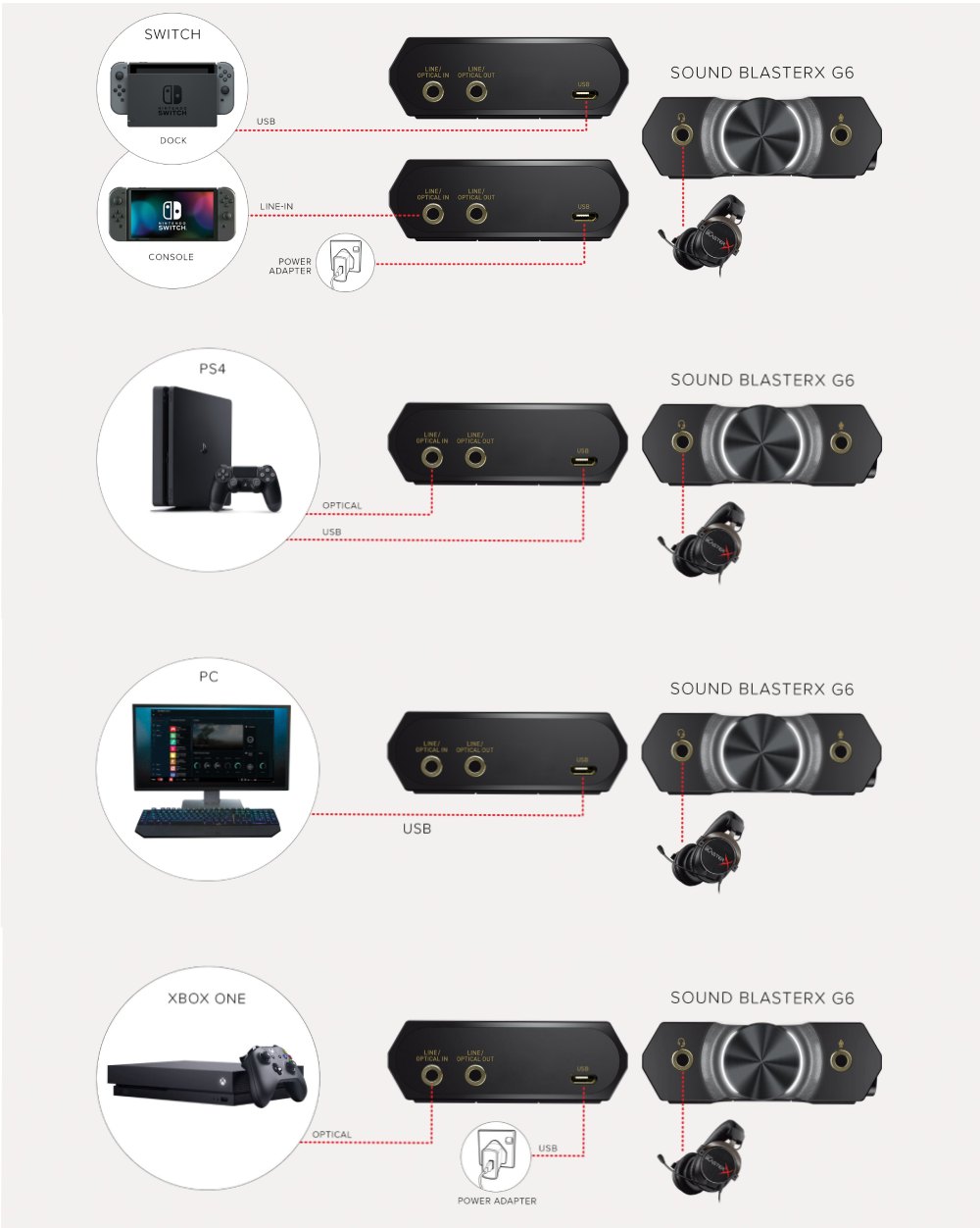 ไม่ว่าคุณจะใช้พีซีหรือคอนโซล เราก็มีให้คุณครบครัน Sound BlasterX G6 มีตัวเลือกการเชื่อมต่อมากมาย ไม่ว่าจะเป็นออปติคัล USB และแม้แต่ไลน์อิน ซึ่งหมายความว่าเสียงในการเล่นเกมของคุณจะถูกปรับปรุงทันที ไม่ว่าคุณจะใช้พีซี PS4 Xbox หรือแม้แต่ Nintendo Switch