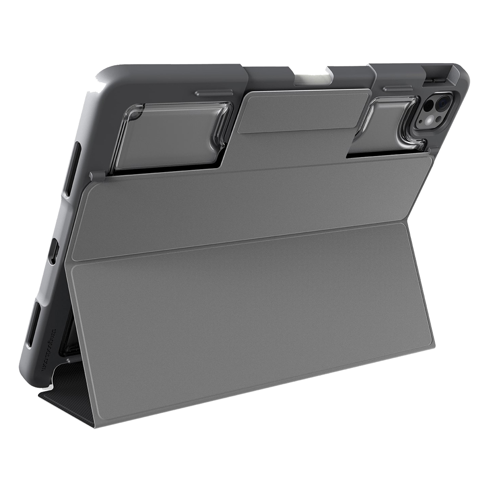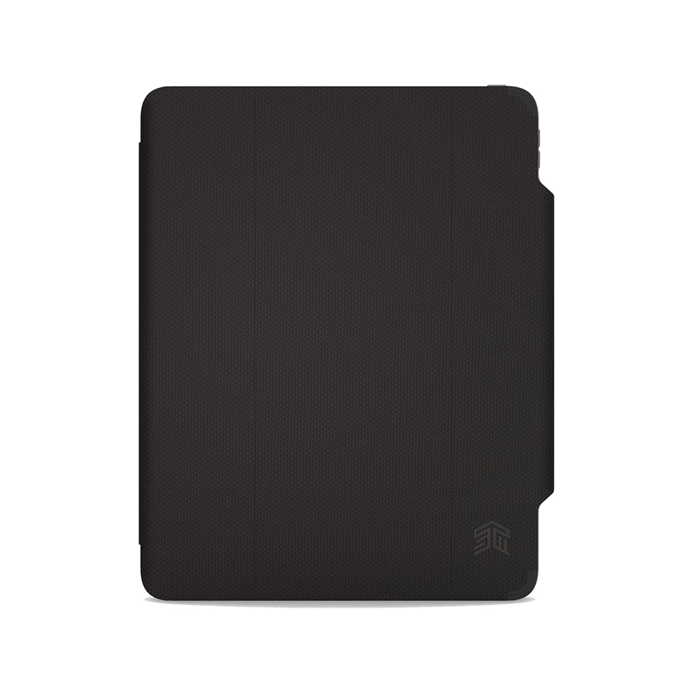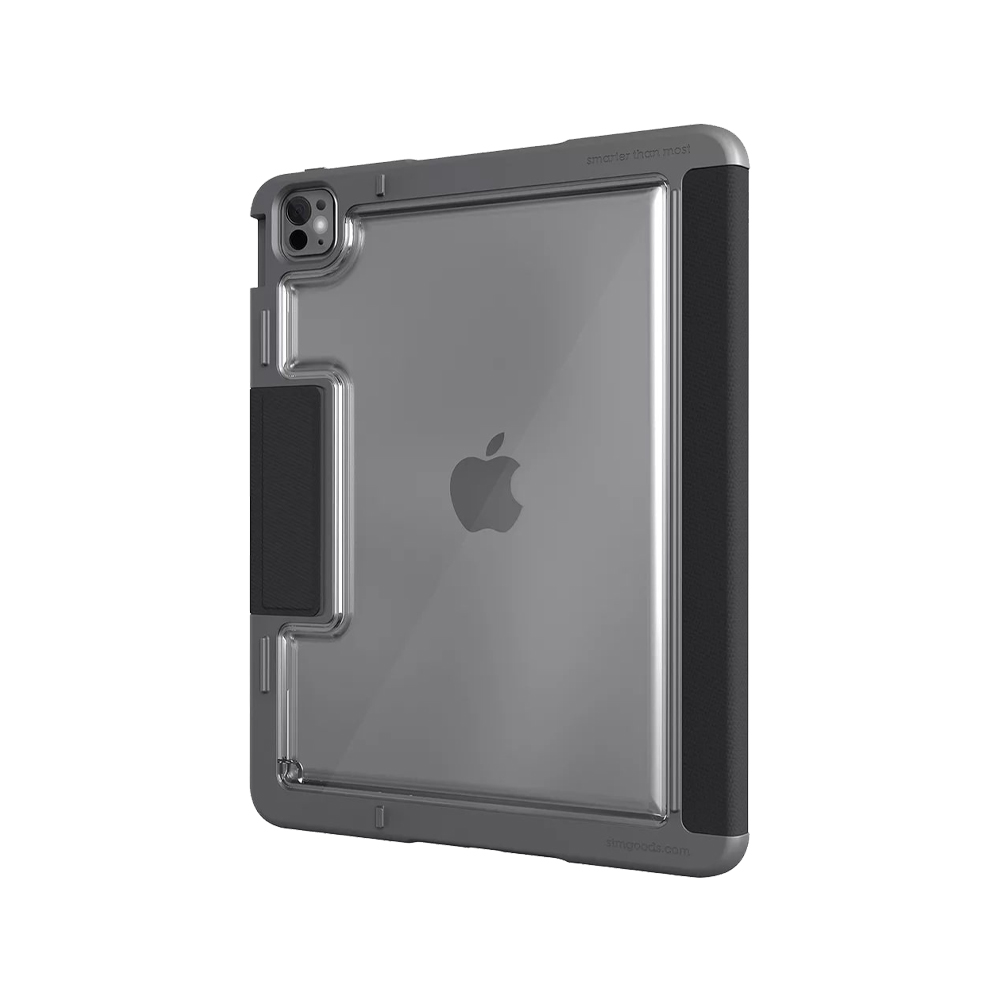 รุ่น Dux Plus Midnight Black แบบฝาพับ ผลิตจากวัสดุ PC พลาสติกใส แข็งแรงช่วยป้องกัน iPad งอ ผสมผสานกับ TPU ที่เป็นยางช่วยดูดซับแรงกระแทกได้เป็นอย่างดี ช่วยปกป้องตัวเครื่องได้รอบด้าน และสามารถพับใช้เป็นขาตั้งแบบปรับระดับสำหรับวางดูวีดีโอได้