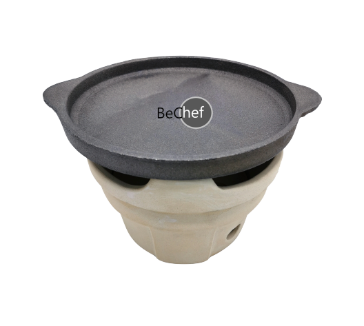 Bechef เซ็ตกระทะเหล็ก จานร้อน 9 นิ้ว พร้อมเตาเซรามิก ใช้ได้กับถ่านหรือแอลกอฮอล์ สำหรับย่างเนย ปิ้งย่าง