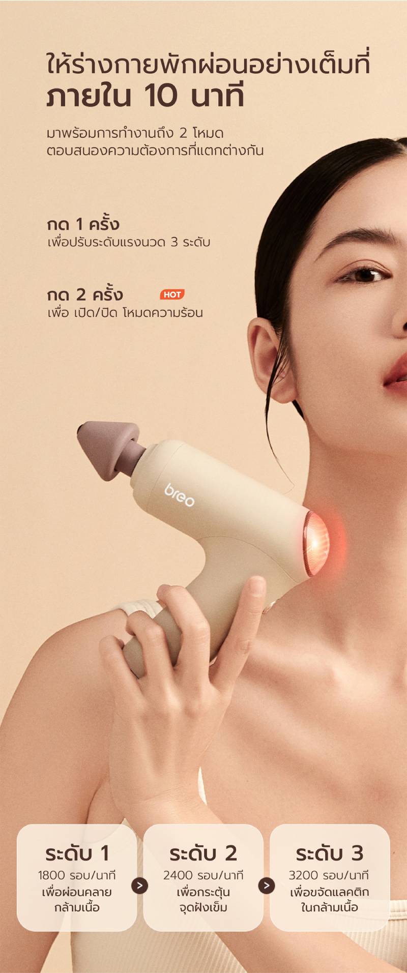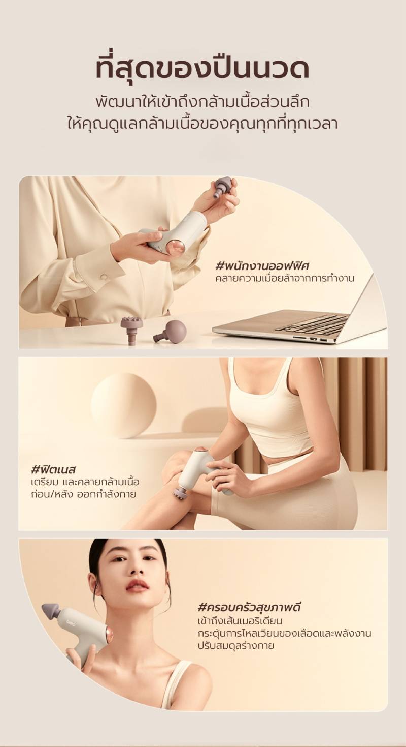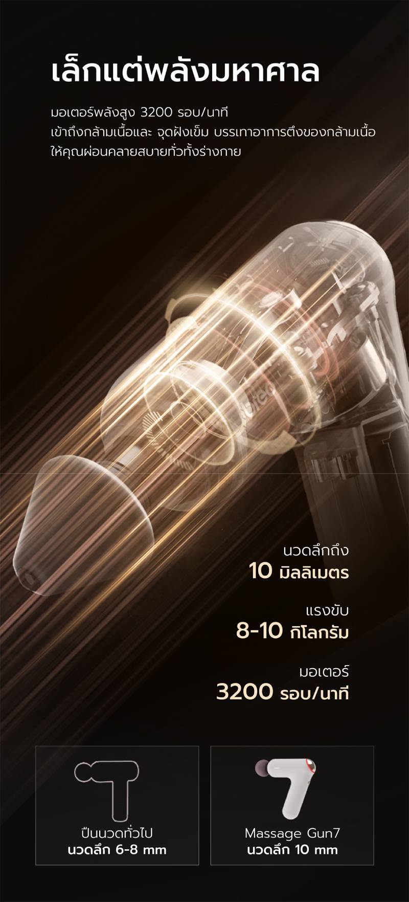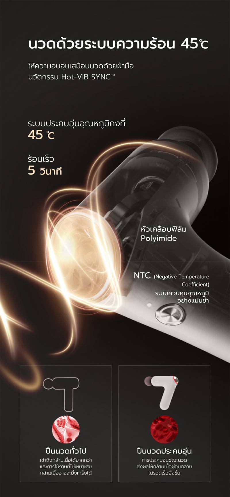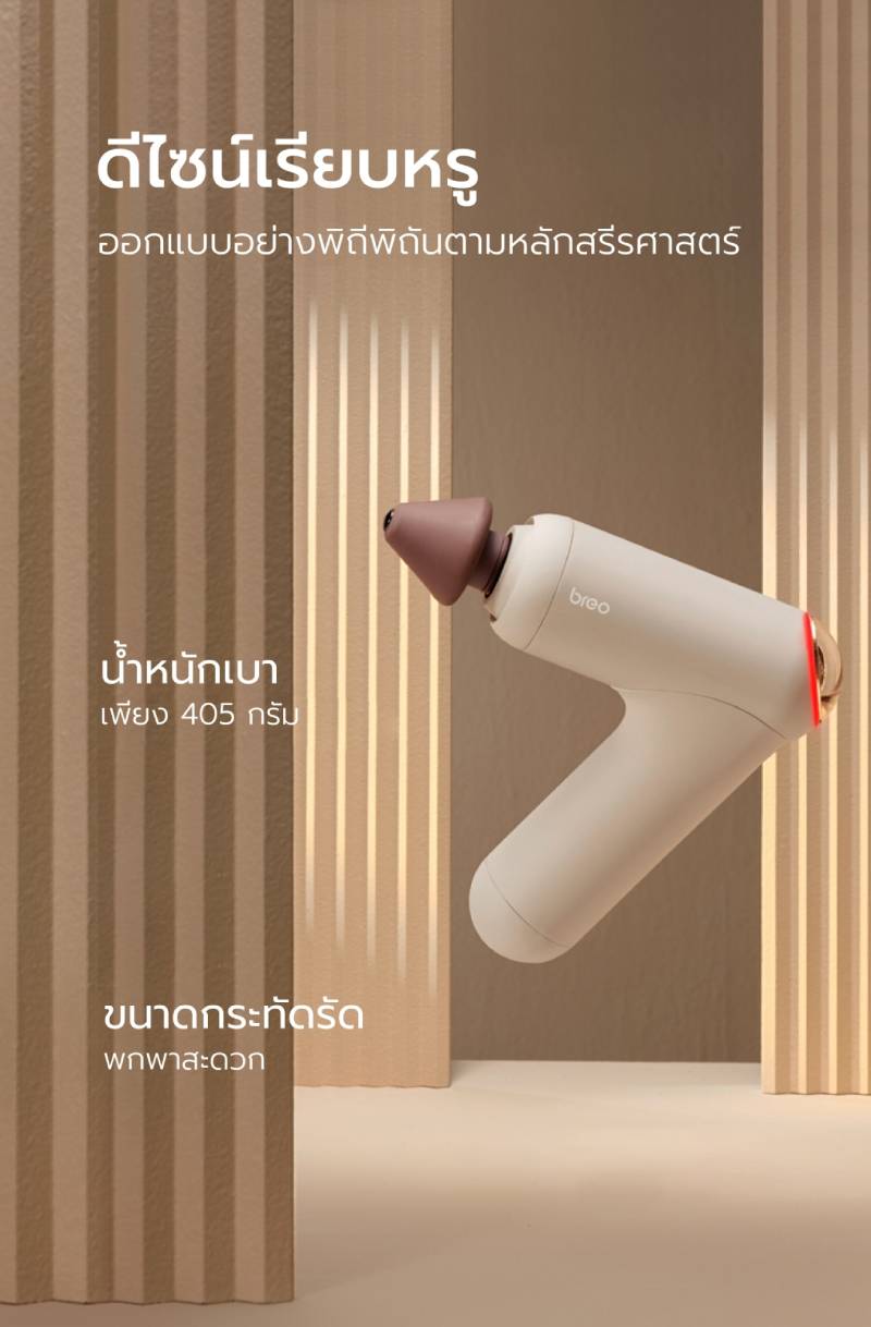 ดีไซน์รูปแบบใหม่ที่โฉบเฉี่ยวและสง่างาม ออกแบบตามหลักหลักการยศาสตร์ จับกระชับถนัดมือ ให้คุณลงน้ำหนักในการนวดได้สะดวกยิ่งขึ้น ขนาดกระทัดรัด 12x4.6x15 ซม. น้ำหนักเบาเพียง 405 กรัม ใช้พลังจากมอเตอร์ไร้แปรงถ่านแรงบิดสูง ยืดอายุการใช้งานให้ยาวนานยิ่งขึ้น ปลอดภัย กินไฟน้อยให้พลัง 3200r/min, แรงสโตรกสูงสุด 17.6lbs, นวดเข้าลึกถึงกล้ามเนื้อชั้นในถึง 10 MM แต่เสียงรบกวนต่ำเพียง 50db มาพร้อมนวัตกรรม Hot-VIB SYNC thermal shock press สามารถให้ความร้อนอย่างรวดเร็วใน 5 วินาที อุณหภูมิคงที่ 45°C ให้ความรู้สึกเหมือนการกดฝ่ามือ ไม่เพียงแต่ร่างกายภายนอกจะรู้สึกผ่อนคลายแต่ยังกระตุ้นการไหลเวียนโลหิตภายในให้กล้ามเนื้อมีความยืดหยุ่นมากขึ้น ฟิล์มความร้อน PI ในตัว ซึ่ง NTC ตรวจสอบแบบเรียลไทม์ ให้อุณหภูมิคงที่สม่ำเสมอและสะดวกสบาย