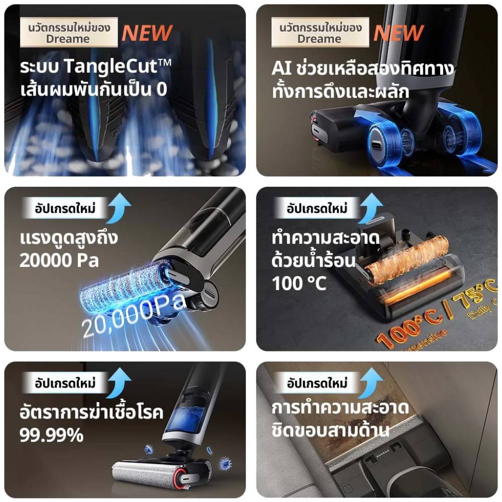 • In the Box : ตัวเครื่องหลัก x1, ที่จับ x1, แปรงลูกกลิ้งสำรอง x1, แท่นชาร์จ x1, แปรงทำความสะอาด x1, ถังกรองขยะมูลฝอย x1, ตัวกรองสำรอง x1, น้ำยาทำความสะอาด x1