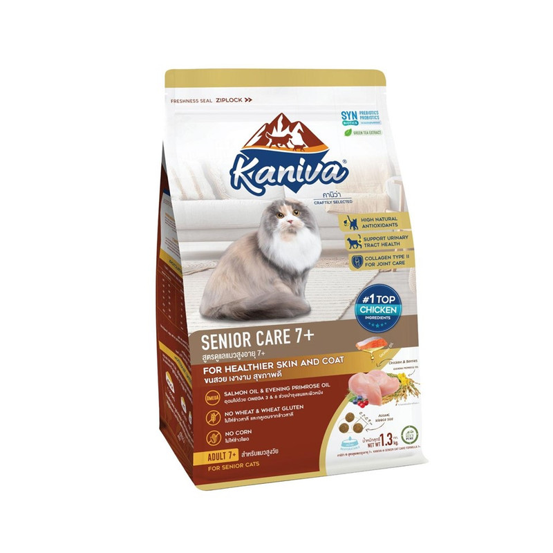 อาหารแมวพรีเมียมที่อุดมไปด้วยคุณค่าสารอาหารตามมาตรฐานของกองควบคุมอาหารสัตว์เลี้ยงแห่งสหรัฐอเมริกา (AAFCO) ทางเราคัดสรรวัตถุดิบคุณภาพสูงเพื่อแมว ""ขน สวย เงางาม สุขภาพดี"" ทวีคูณความอร่อยให้น้องเหมียวด้วยเนื้อไก่ที่เป็นส่วนผสมหลัก มีโปรตีนสูงช่วยเสริมสร้างกล้ามเนื้อ แคลเซียมและฟอสฟอรัสเพื่อกระดูกและฟันที่แข็งแรง ไลซีนช่วยเสริมสร้างภูมิต้านทาน MOS พรีไบโอติกจากธรรมชาติ เสริมสร้างภูมิต้านทาน สร้างสมดุลในระบบทางเดินอาหาร ทั้งยังมีใยอาหารสูง ช่วยในเรื่องระบบขับถ่าย ลดการเกิดก้อน ขน สารสกัดจากยัคคาเพิ่มประสิทธิภาพการย่อย ลดกลิ่นฉุนในปัสสาวะ และกลิ่นมูล ปราศจากส่วนผสมของข้าวสาลีและข้าวโพด อุดมไปด้วยคุณค่าสารอาหารที่เหมาะสมสําหรับ แมวสูงวัยอายุ 7 ปีขึ้นไปโดยเฉพาะ