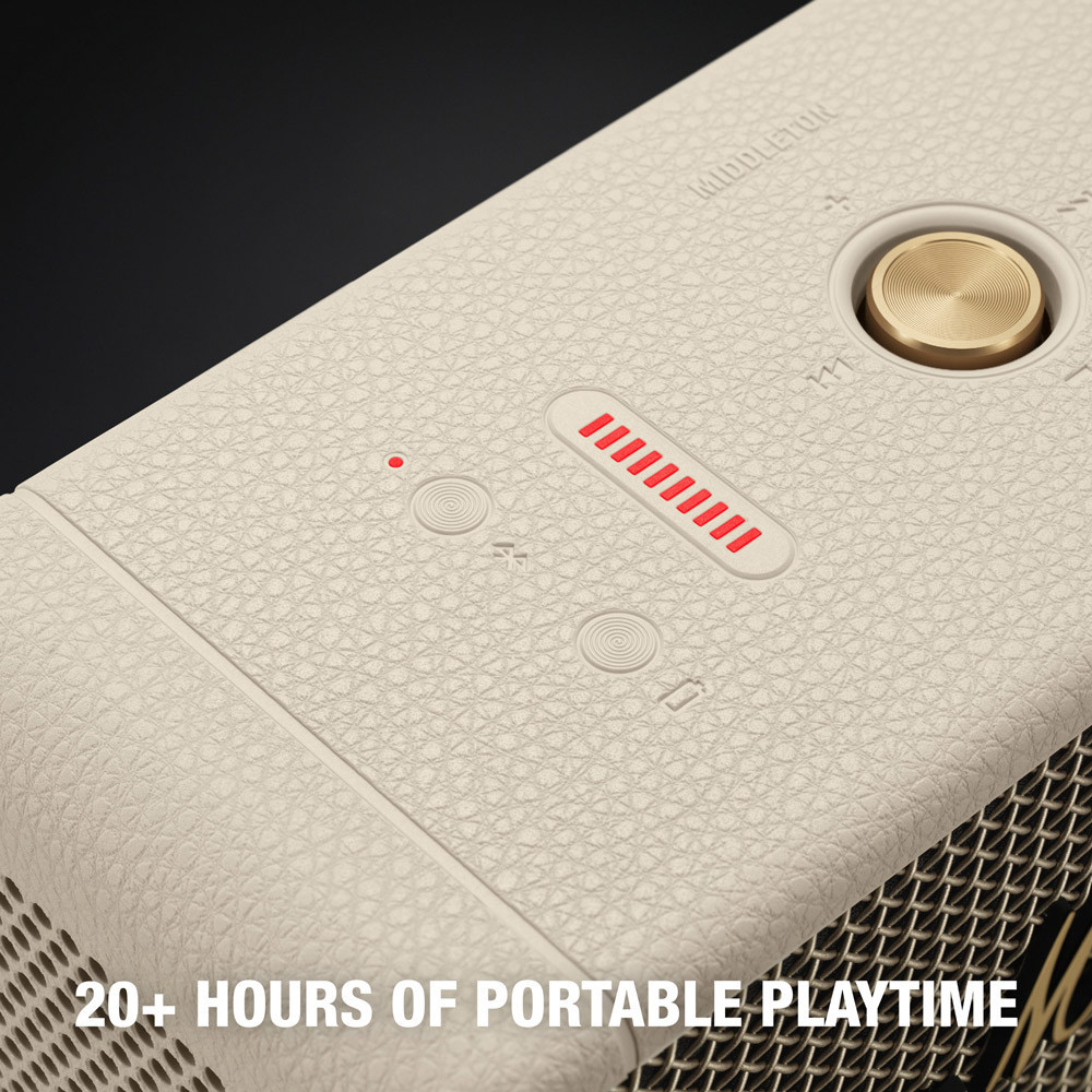 Middleton ช่วยให้เพลงเล่นต่อเนื่องได้นานถึง 20+ ชั่วโมงต่อการชาร์จหนึ่งครั้ง เมื่อคุณจำเป็นต้องชาร์จ ให้เสียบปลั๊กลำโพง แล้วแบตเตอรี่จะกลับมาเต็มในเวลาเพียง 4.5 ชั่วโมง