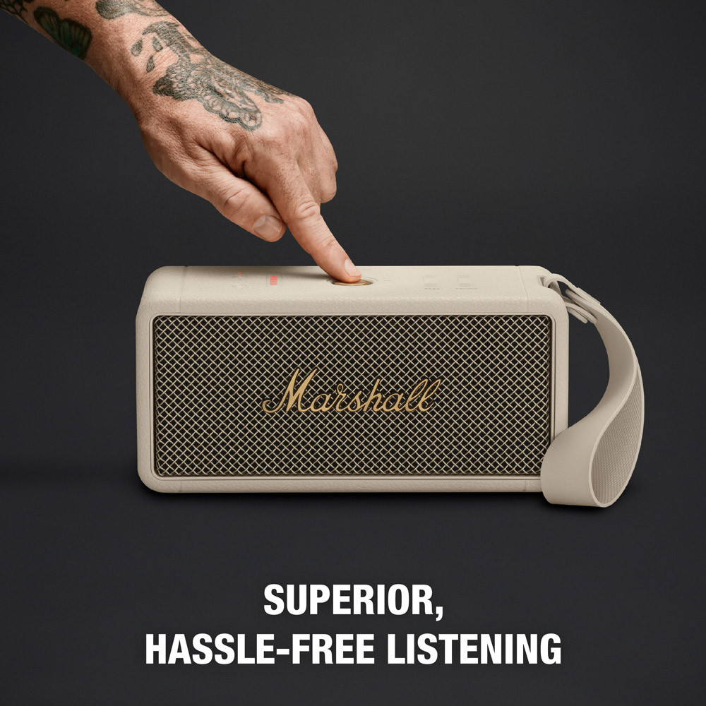 พกเสียงแบบพกพาที่หนักที่สุดไว้ในมือคุณ Middleton ใช้ True Stereophonic ซึ่งเป็นรูปแบบเฉพาะของเสียงสเตอริโอหลายทิศทางจาก Marshall เพื่อมอบประสบการณ์ที่ดื่มด่ำขั้นสูงสุดไม่ว่าคุณจะท่องไปในที่ใด