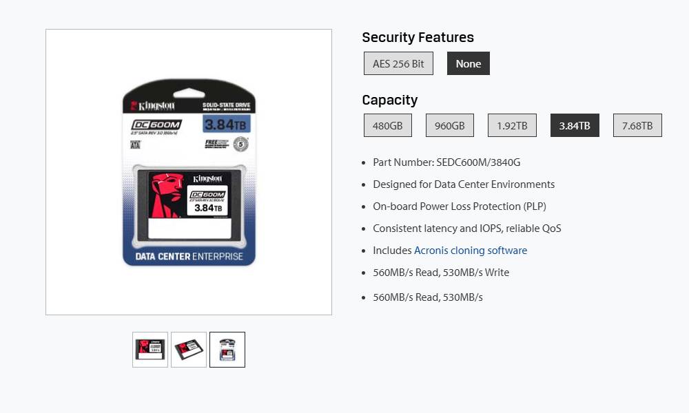SSD DC600M และ DC600ME ของ Kingston เป็น SSD SATA 3.0 6Gbps เจเนอเรชันที่ 4 สำหรับศูนย์ข้อมูลที่ใช้ 3D TLC NAND ซึ่งออกแบบมาสำหรับเวิร์กโหลดเซิร์ฟเวอร์ "แบบใช้งานผสม" ทั้งสองรุ่นเหมาะอย่างยิ่งสำหรับแอปพลิเคชันเซิร์ฟเวอร์ที่หลากหลายและรวมถึงการป้องกันการสูญเสียพลังงานบนบอร์ดผ่านตัวเก็บประจุแบบหน่วงเวลา DC600M และ DC600ME ได้รับการออกแบบมาเพื่อป้องกันข้อมูลจากไฟดับโดยไม่คาดคิดและเพื่อให้แน่ใจว่าไดรฟ์จะเริ่มต้นใหม่ได้สำเร็จเมื่อเปิดระบบครั้งต่อไป ออกแบบมาเพื่อมอบความหน่วงเวลาต่ำและความสม่ำเสมอของ IO สำหรับผู้รวมระบบ ศูนย์ข้อมูลไฮเปอร์สเกล และผู้ให้บริการคลาวด์