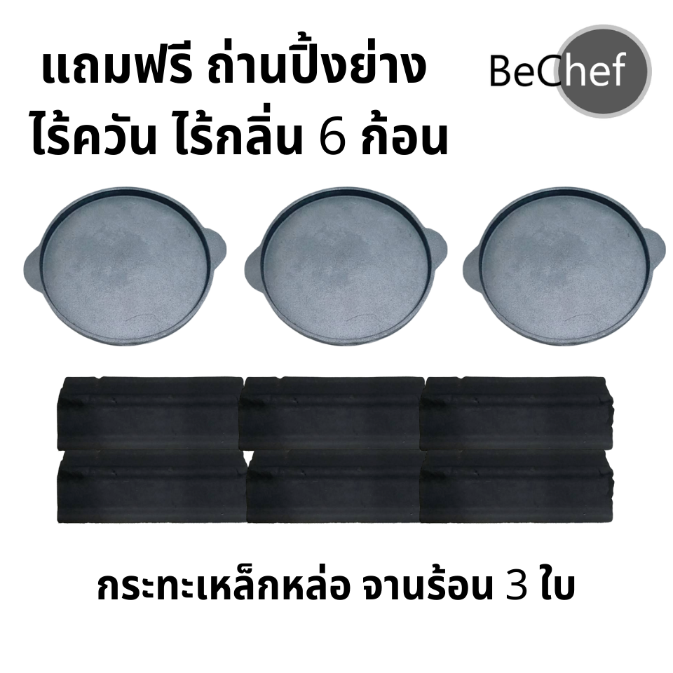 Bechef กระทะ เหล็กหล่อ กระทะร้อน กระทะหอยทอด ออส่วน กระทะย่างเนย กระทะเหล็ก ปิ้งย่าง กระทะเนื้อย่าง กระทะเหล็ก กระทะแบน กระทะย่างเกาหลี จานร้อน เครป ขนาด 8 นิ้ว 3 ใบ แถมฟรี ถ่านไร้ควัน 6 ก้อน