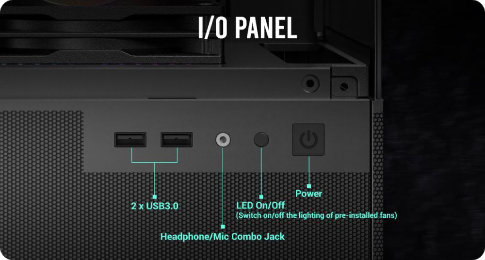 ด้านหน้าของเคส มีแผง I/O พาแนลสำหรับเชื่อมต่อการใช้งานได้สะดวกยิ่งขึ้น