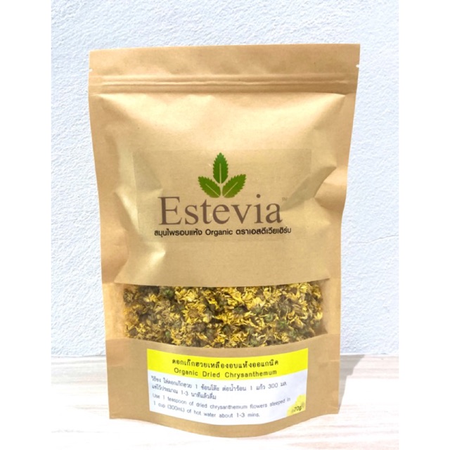 เก๊กฮวยอบแห้ง ขนาดบรรจุ 70 กรัม เก๊กฮวยอุดมไปด้วยสารฟลาโวนอยด์ (Flavonoids) ซึ่งเป็นสารที่มีคุณสมบัติต่อต้านอนุมูลอิสระ ละลายได้ดีในน้ำ ดังนั้นการดื่มน้ำเก็กฮวยนอกจากจะสดชื่น ช่วยดับกระหายแล้ว ยังได้รับสารต้านอนุมูลอิสระที่ช่วยยับยั้งเซลล์มะเร็ง และช่วยชะลอวัย ทำให้ผิวพรรณสดใสอีกด้วย นอกจากนี้เก็กฮวยยังมีคุณสมบัติเด่นในเรื่องของการขับสารพิษในร่างกาย และยังเป็นยาระบายอ่อนๆ ช่วยขับลม ช่วยให้รู้สึกสดชื่น สบายท้อง อีกทั้งในเก็กฮวยยังมีสารโคลีน ที่ช่วยให้ร่างกายสร้างเลซิติน ที่ช่วยลดไขมัน ลดคอเลสเตอรอลได้ การดื่มน้ำเก็กฮวยที่ใช้น้ำตาลจากหญ้าหวาน หรือผสมสมุนไพรหญ้าหวานอบแห้ง จากธรรมชาติ ไม่ทำให้อ้วน แต่ช่วยเผาผลาญไขมันได้ดี แถมยังช่วยฟื้นฟูตับอ่อน ในผู้ป่วยเบาหวานได้ดีอีกด้วย สรรพคุณเก๊กฮวย -ช่วยดับร้อน -ช่วยกระตุ้นระบบย่อยอาหาร -ดีต่อหัวใจ -แก้ตาบวมแดง -แก้วิงเวียน -รักษาแผลฝีหนอง -รักษาผมร่วง วิธีทำน้ำเก๊กฮวย 1. ใช้ดอกเก๊กฮวยแห้งประมาณ 1 กำมือ (15 กรัม) นำมาต้มกับน้ำเดือดประมาณ 2 ลิตร 2. ต้มดอกเก๊กฮวยสัก 2-3 นาที แล้วใส่ไซรัปหญ้าหวานลงไป (ความหวานตามชอบ) หรือใช้สมุนไพรใบหญ้าหวานอบแห้ง 3. ใช่เวลาคนประมาณ 2 นาที ปิดไฟ พักไว้จนเย็น กรองกากออก 4. เมื่อน้ำเก๊กฮวยพออุ่น ๆ สามารถเทใส่แก้วแล้วดื่มได้เลย หรือจะพักน้ำเก๊กฮวยให้เย็นจากนั้นเติมน้ำแข็งดื่มแบบเย็น ๆ ให้ชื่นใจก็ได้ วิธีเก็บรักษา เก็บไว้ในที่แห้งไม่อับชื้น