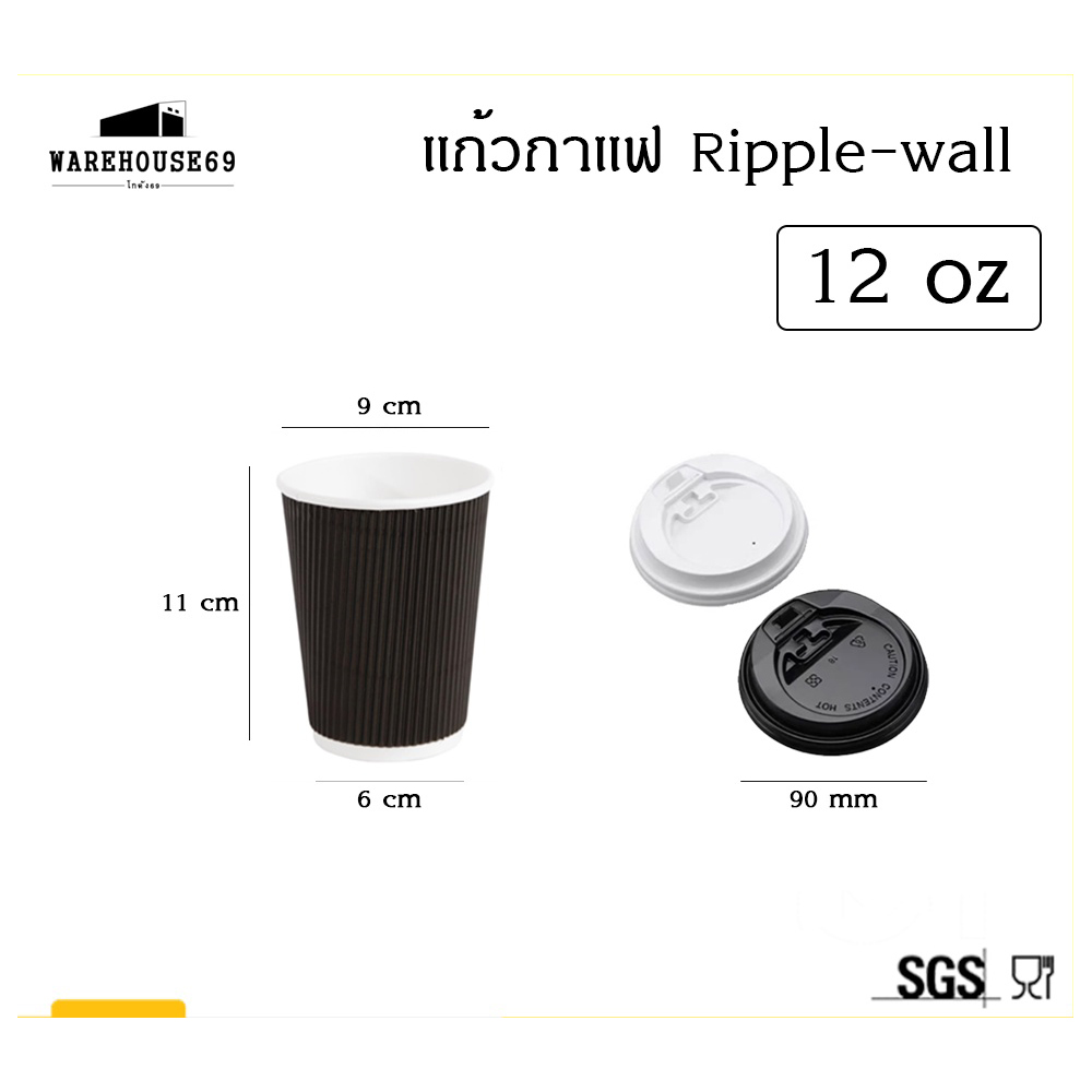 BIOPACK แก้วกาแฟ Ripple-Wall (Ripple สีดำ 12 oz ไม่เอาฝา ,50 ใบ) 4oz / 8oz / 12oz / 16oz แก้วกระดาษ 2 ชั้นพร้อมฝา แก้วกาแฟ ถ้วยกาแฟ แก้วกาแฟกระดาษ [[50 ใบ]]