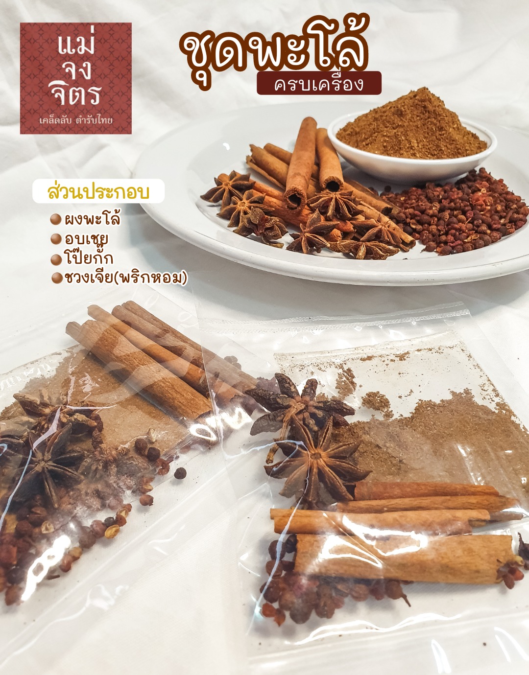 เครื่องพะโล้ ชุดพะโล้ ผงพะโล้ สามารถนำไปทำอาหารได้หลากหลายเมนู เช่น ไข่พะโล้ ขาหมู เป็ดตุ๋น ไก่ตุ๋น เป็นต้น เครื่องเทศประกอบด้วย - ผงพะโล้ - ไม้อบเชย - โป๊ยกั๊ก - พริกหอม อายุสินค้า : เก็บไว้ได้นาน 6 เดือน เมื่อเปิดปากถุงแล้วควรปิดให้สนิท และเก็บไว้ในที่แห้ง