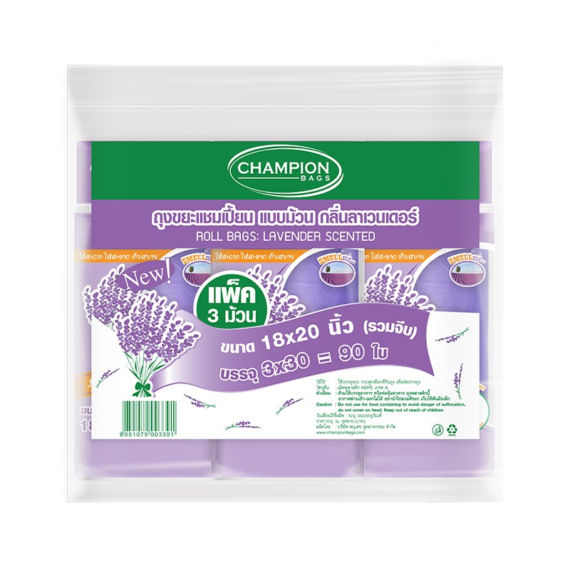 แชมเปี้ยน ถุงขยะม้วน กลิ่นลาเวนเดอร์ - สะดวกใช้งานด้วยรูปแบบม้วน สามารถฉีกได้ทีละใบ - ขนาด 18x20 นิ้ว - ม้วนละ 90 ใบ - 1 แพ็ค บรรจุ 3 ม้วน