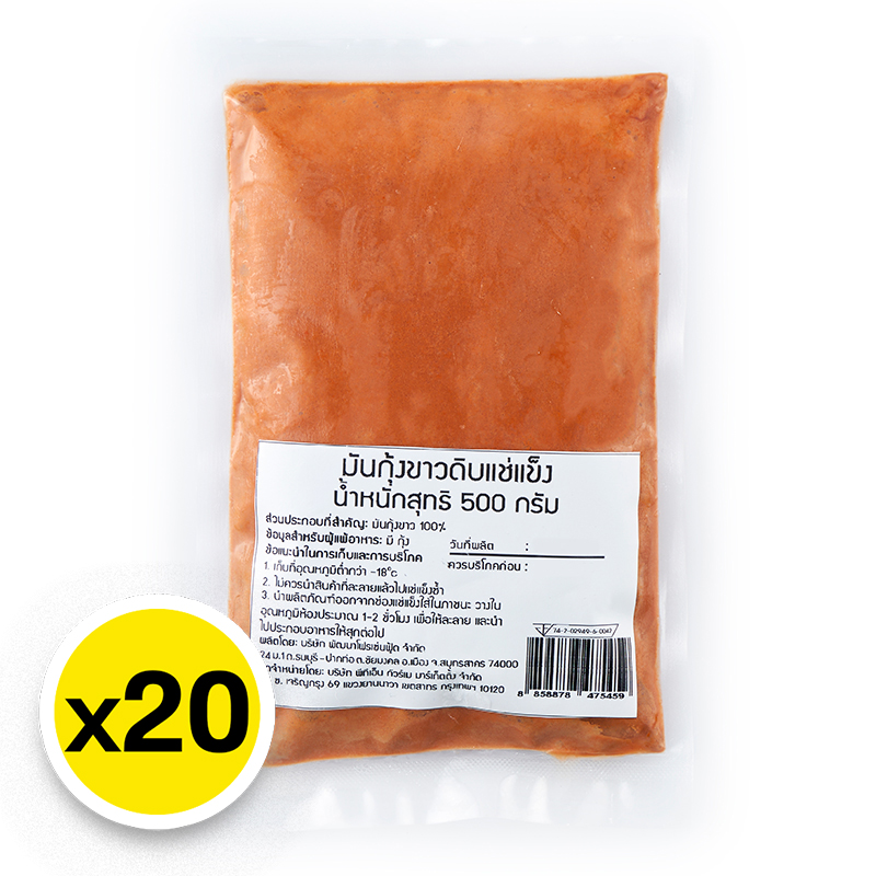 - ชื่อสินค้า: มันกุ้งขาวแช่แข็ง 500 ก. x 20 - แบรนด์: แม็คโคร - ปริมาณบรรจุ: 20 หน่วย