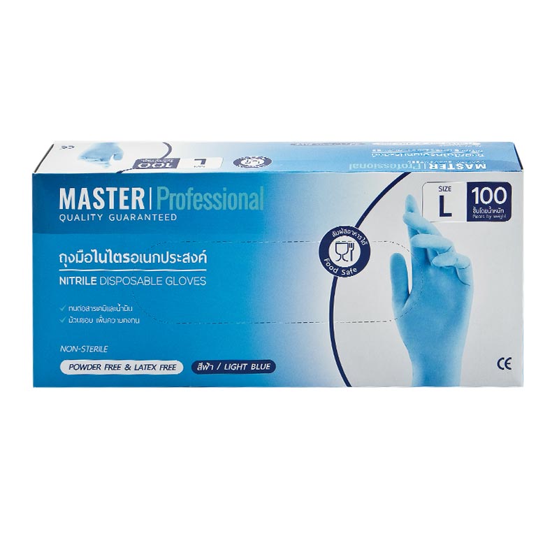 มาสเตอร์โปร ถุงมือไนไตรฟ้า ขนาด 9 นิ้ว ไซส์ L 100 ชิ้น