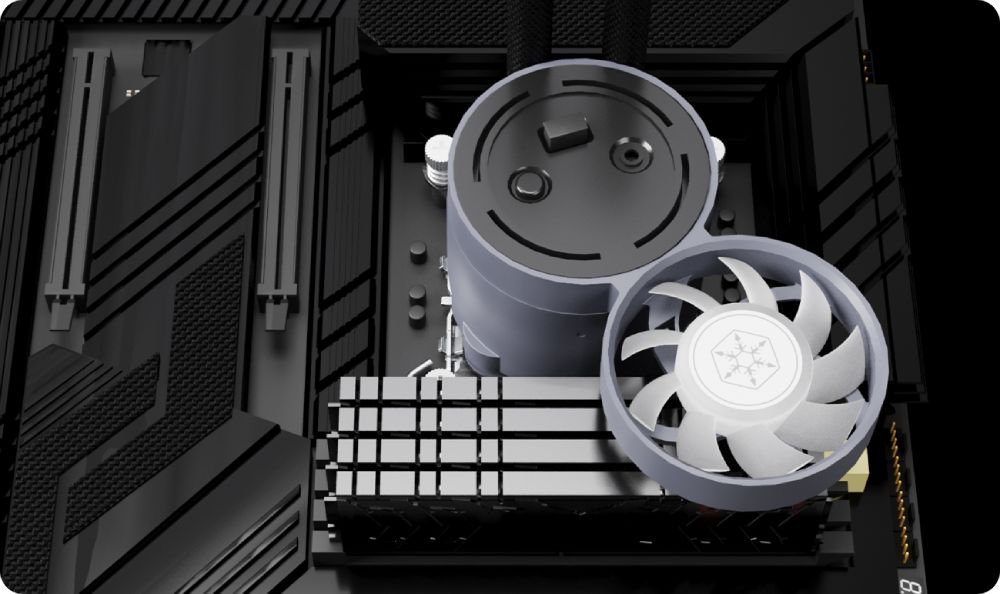 ชุดระบายความร้อนซีพียูแบบหม้อน้ำ SilverStone IceMyst 360 ต่างจาก AIO อื่น ๆ ในตลาดที่บล็อกน้ำทำหน้าที่เพียงเป็นที่อยู่อาศัยของปั๊ม บล็อกน้ำที่ออกแบบใหม่ของ SilverStone ช่วยให้สามารถติดตั้งพัดลม IMF70 ARGB ได้โดยตรงบนตัวปั๊ม และยังหมุนได้ 360 องศา นวัตกรรมนี้ช่วยให้คุณสามารถใช้พัดลม IMF70 ARGB ช่วยระบายความร้อนจุดที่มีความร้อนสูงบนเมนบอร์ดได้