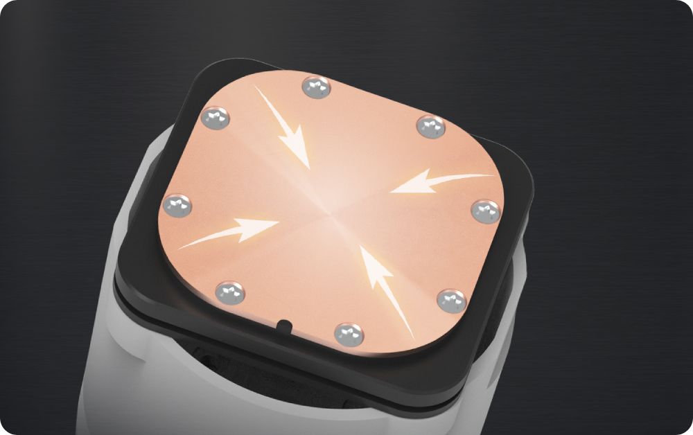แผ่นฐานทองแดงที่มีความนูนเล็กน้อยช่วยให้สัมผัสกับโปรเซสเซอร์ได้อย่างแน่นหนา