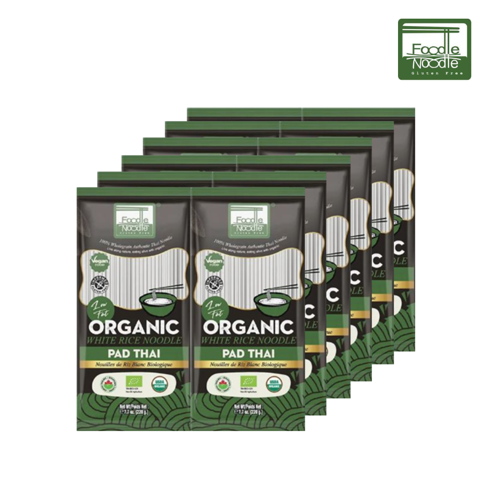 เส้นผัดไทยออร์แกนิค 4 มม.x12 ห่อ เส้นก๋วยเตี๋ยวจากข้าวขาวไทยอินทรีย์ ได้รับการรับรองมาตรฐานเกษตรอินทรีย์ EU/COR และ USDA ความหนา 4 มม. เหมาะสำหรับเมนูผัด เช่น ผัดไทย ผัดขี้เมา และพาสต้า ปราศจากกลูเตน เนื้อสัมผัสนุ่มแต่แน่นและมีกลิ่นหอมชวนรับประทาน