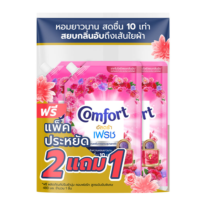 - ชื่อสินค้า: คอมฟอร์ท อัลตร้า น้ำยาปรับผ้านุ่ม สูตรเข้มข้น สีชมพู 480 มล. x 2+1 - แบรนด์: คอมฟอร์ท - ปริมาณบรรจุ: 3 หน่วย