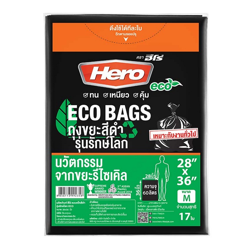 ฮีโร่ ถุงขยะสีดำ รุ่นรักษ์โลก 28 x 36 นิ้ว x 17