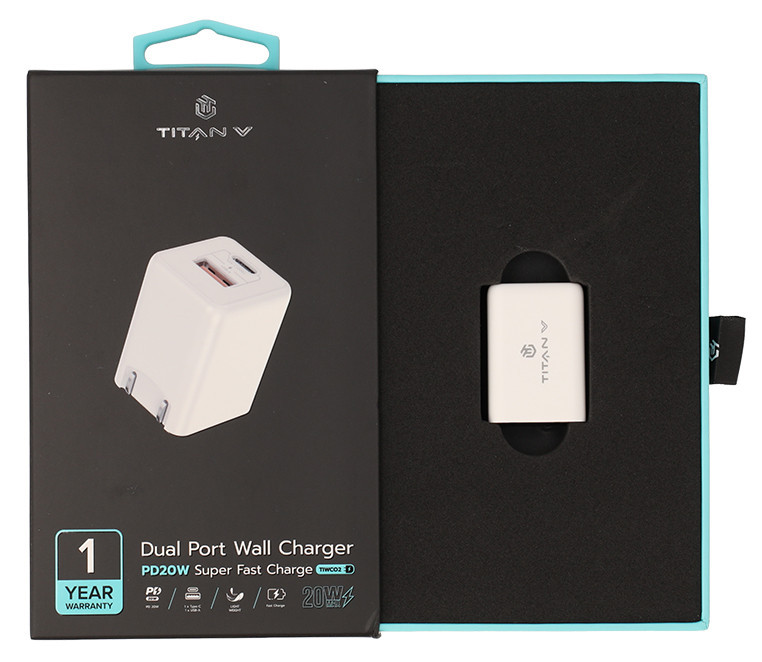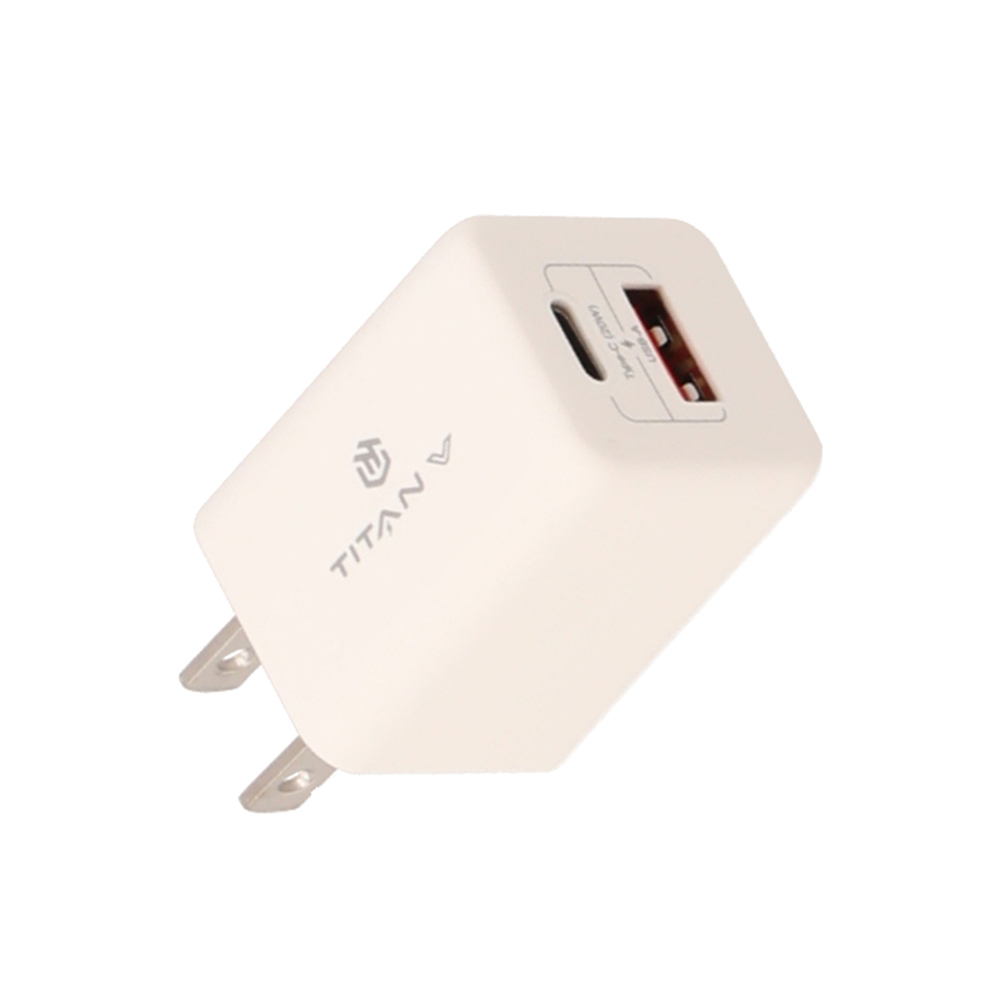 อะแดปเตอร์ TITANV Wall USB Charger 1 USB-A (QC3.0A) / 1 USB-C (PD20W) TI-WC01 White TITAN V PD20Wหัวชาร์จเร็ว Fast Charger สำหรับ (Type-C/USB) น้ำหนักเบา 20W หัวชาร์จเร็ว TITAN V PD20W ชาร์จด้วยความเร็ว Power Delivery 20W รองรับการชาร์จด้วยพอร์ต USB-C และ USB-L หัวปลั๊กพับได้ 90 องศา