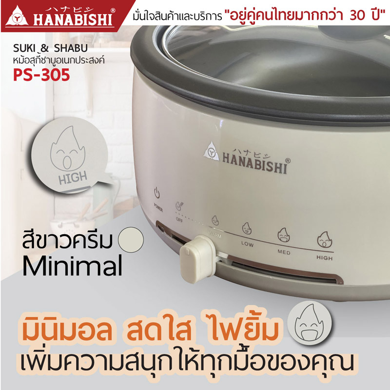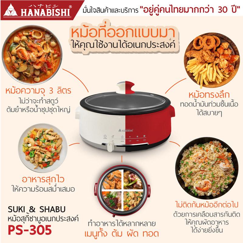 กำลังไฟฟ้า 1300 วัตต์ หม้อสุกี้ฝาแก้ว หม้อในเคลือบสารกันติด ถอดล้างทำความสะอาดง่าย ปรับระดับความร้อนได้ 4 ระดับ ทำอาหารได้หลากหลาย ทอด, ผัด, ต้ม,ตุ๋น