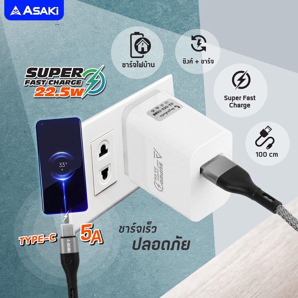 อุปกรณ์ชาร์จไฟอเนกประสงค์ อะแดปเตอร์(AC) ชาร์จไฟบ้านได้ด้วยกำลังไฟสูงสุด 22.5W พร้อมสายType C รองรับการใช้งานกับสมาร์ทโฟนและอุปกรณ์ที่รองรับ สามารถชาร์จไฟจากคอมพิวเตอร์ผ่านพอร์ทยูเอสบี รวมถึงยังสามารถโอนย้ายข้อมูล (Data Transfer) ผ่านสาย Type C ได้อีกด้วย (เฉพาะรุ่นที่รองรับ)