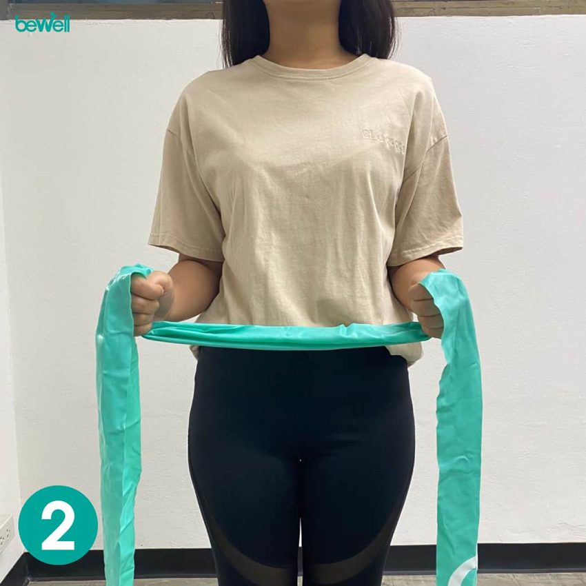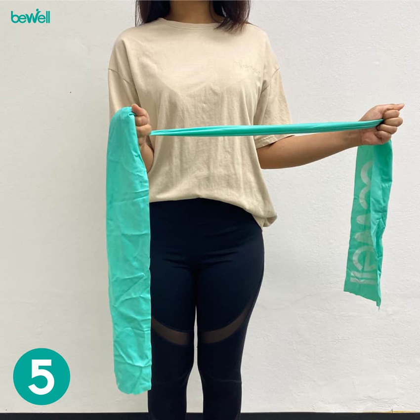 ลักษณะท่าทาง : เริ่มจากจับยางยืดไว้ทั้งสองมือ ให้ศอกอยู่ข้างลำตัว หลังจากนั้นดึงยางยืดออกออกจากลำตัวพร้อมทั้งสองข้างเพื่อให้กล้ามเนื้อสะบักหุบเข้าหากัน