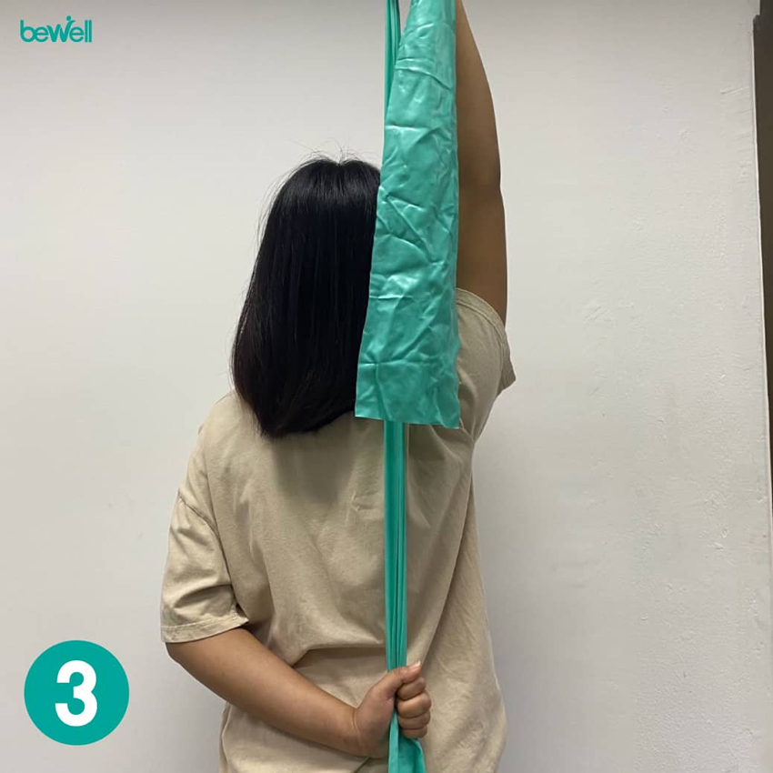 ลักษณะท่าทาง : เริ่มจากให้นำมือข้างที่มีอาการไหล่ติดไพร่แขนไปด้านหลัง ให้เอาเอื้อมไปแตะด้านหลังให้มากที่สุด หลังจากนั้นจับยางยืดด้วยสองมือตามรูป แล้วออกแรงดึงยางยืดขึ้นด้วยมือที่ไพร่หลังด้านบนเพื่อให้กล้ามเนื้อของไหล่ที่ติดได้ถูกการขยับและถูกการยืดไปด้วย