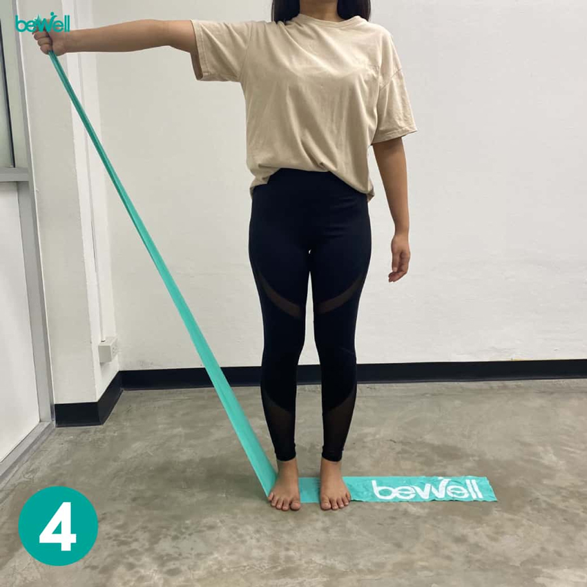 ลักษณะท่าทาง : เริ่มจากเหยียบยางยืดด้วยเท้าข้างที่ต้องการจะออกกำลังกาย นำมือจับยางยืดไว้แล้วพยายามออกแรงกางแขนออกจากลำตัวแล้วพยายามกางออกให้แขนขึ้นมาแนบหูหรือกางออกในตำแหน่งที่มีอาการตึงตัว