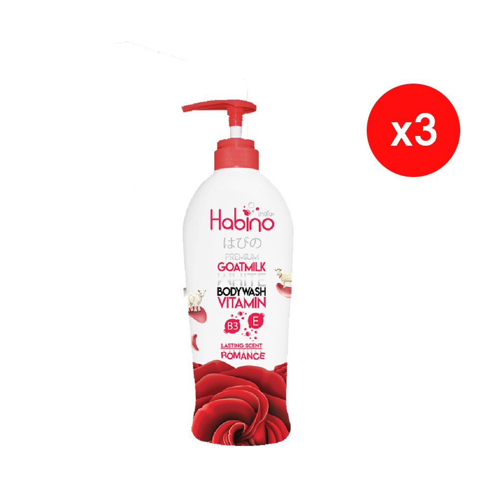 ฮาบิโนะ ครีมอาบน้ำสูตรโลชั่นน้ำนม มีสารสกัดน้ำนมแพะ วิตามิน อี และ บี 3 กลิ่นโรแมนซ์ สีแดง 500 ml. 3 ขวด