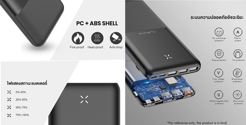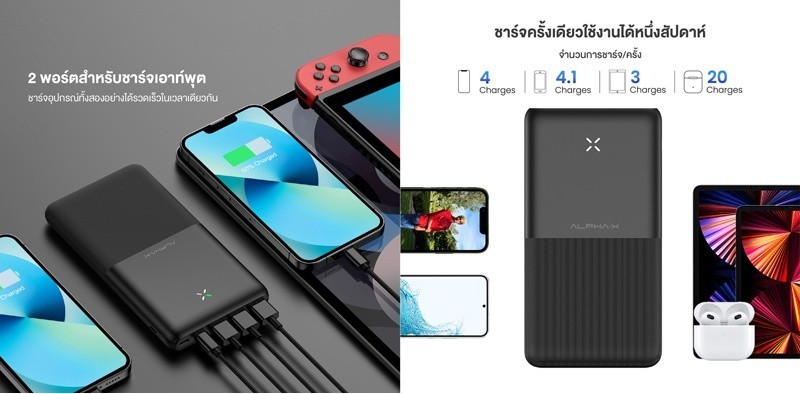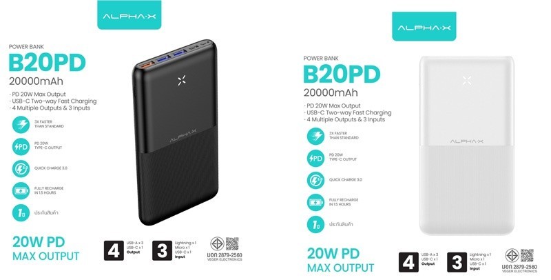 ► Alpha Power Bank รุ่น B20PD ขนาดความจุแบตเตอรี่ 20000 mah มาตรฐาน มอก. จ่ายกระแสไฟพอร์ต 4 ช่อง แบ่งออกเป็น USB-A1 และ USB-A2 กระแสไฟสูงสุด 2.4mAh 5V ส่วน USB-A3 จ่ายกระแสไฟสูงสุด 3mAh 5V / พอร์ต USB-C จ่ายกระแสไฟสูงสุด 5V 3mAh รองรับเทคโนโลยี Quick Charge 3.0 และสามารถเสียบรับระแสไฟของการชาร์จพาวเวอร์แบงค์ได้ด้วย การรับกระแสไฟของการชาร์จพาวเวอร์สามารถใช้ได้ถึง 3 หัวชาร์จ Lightning / Micro / Type-C รองรับสายชาร์จ USB-A อีกฝั่งเป็นสามารถเป็นหัวชาร์จ Lightning / Micro / Type-C ซึ่งเข้ากับอุปกรณ์ได้หลากหลาย เทคโลยีสุดล้ำ Dynamic Detect การจ่ายไฟอัจฉริยะ มีไฟ LED แสดงสถานะของแบตเตอรี่
