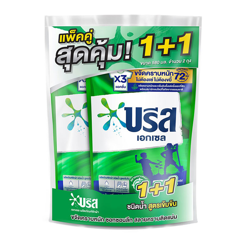 - ชื่อสินค้า: บรีสเอกเซล น้ำยาซักผ้า สูตรเข้มข้น สีเขียว 580 มล. 1+1 - แบรนด์: บรีส - ปริมาณบรรจุ: 2 หน่วย