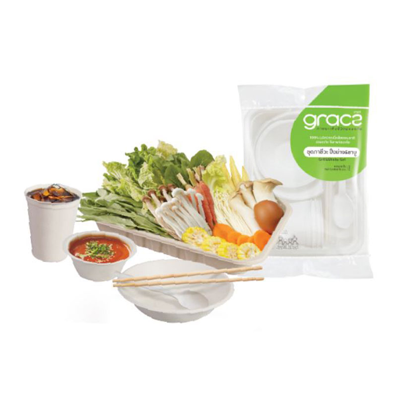 เกรซ ชุดภาชนะ ปิ้งย่าง-ชาบู (บรรจุ 16 ชิ้น/ชุด) แบรนด์ : เกรซ รุ่น : FT03 สี : White อายุสินค้า : 5 ปี สินค้าภายในเซต ถาด 1500 มล. จำนวน 1 ชิ้น ชาม 460 มล. จำนวน 3 ชิ้น ชาม 230 มล. จำนวน 3 ชิ้น แก้ว 260 มล. จำนวน 3 ชิ้น ช้อน จำนวน 3 ชิ้น ตะเกียบ จำนวน 3 คู่ รวมทั้งหมด 16 ชิ้น / ชุด รายละเอียดสินค้า เกรซชุดปิ้งย่าง-ชาบู ที่เป็นภาชนะที่ผลิตจากธรรมชาติ 100% ที่ผลิตจากสิ่งของที่เหลือทิ้งตามธรรมชาติ (ไม่ได้มีการตัดต้นไม้) และสามารถนำกลับมาเป็นนวัตกรรมใหม่ที่สร้างคุณภาพชีวิตที่ดีและยั่งยืน คุณสมบัติ สามารถเข้าไมโครเวฟและเตาอบได้ วิธีการใช้งาน ใช้ใส่อาหาร