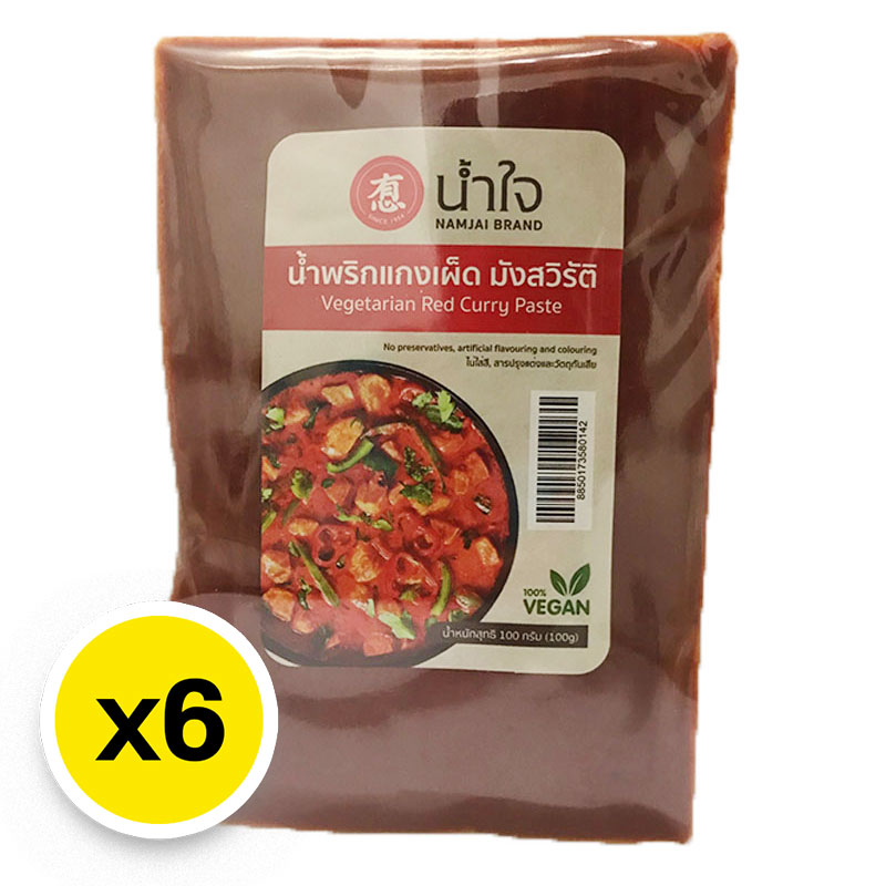 - ชื่อสินค้า: น้ำใจ พริกแกงเผ็ดมังสวิรัติ 100 ก. x 6 - แบรนด์: น้ำใจ - ปริมาณบรรจุ: 6 หน่วย