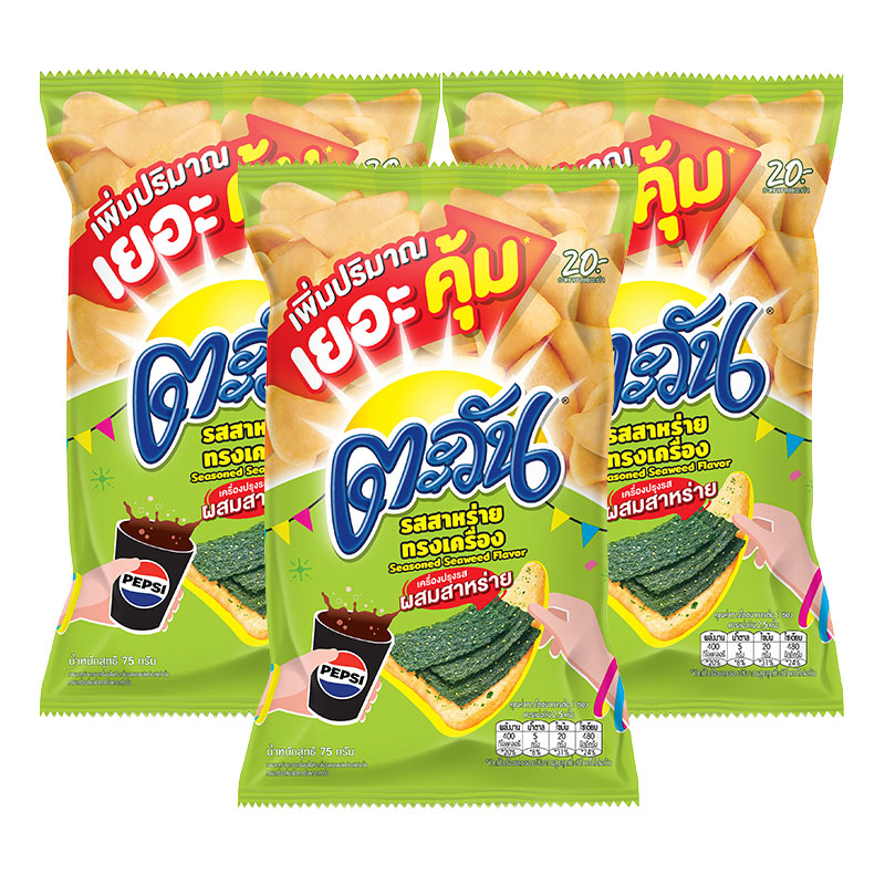 - ชื่อสินค้า: ตะวัน ข้าวเกรียบ รสสาหร่ายทรงเครื่อง 75 ก. x 3 - แบรนด์: ตะวัน - ปริมาณบรรจุ: 3 หน่วย