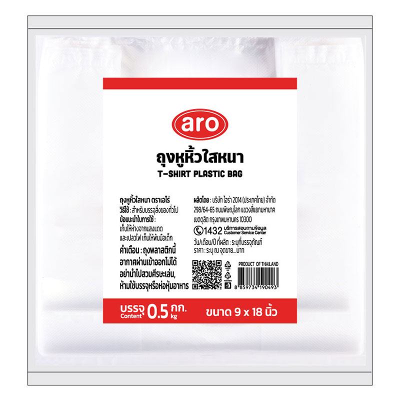 รายละเอียดสินค้า : ถุงหูหิ้ว เอโร่ ชนิดหนา บรรจุ 0.5 กก./แพ็ค จุดเด่น/คุณสมบัติ : เนื้อถุงใส แข็งแรง รับน้ำหนักได้ดี ปลอดภัย ไม่มีกลิ่น ผลิตจากเม็ดพลาสติก HDPE วิธีใช้ : สำหรับบรรจุสิ่งของทั่วไป ข้อแนะนำการใช้ : เก็บให้ห่างจากแสงแดดและเปลวไฟ เก็บให้พ้นมือเด็ก คำเตือน : ถุงพลาสติกนี้อากาศผ่านเข้าออกไม่ได้ อย่านำไปสวมศีรษะเล่น ห้ามใช้บรรจุหรือห่อหุ้มอาหาร