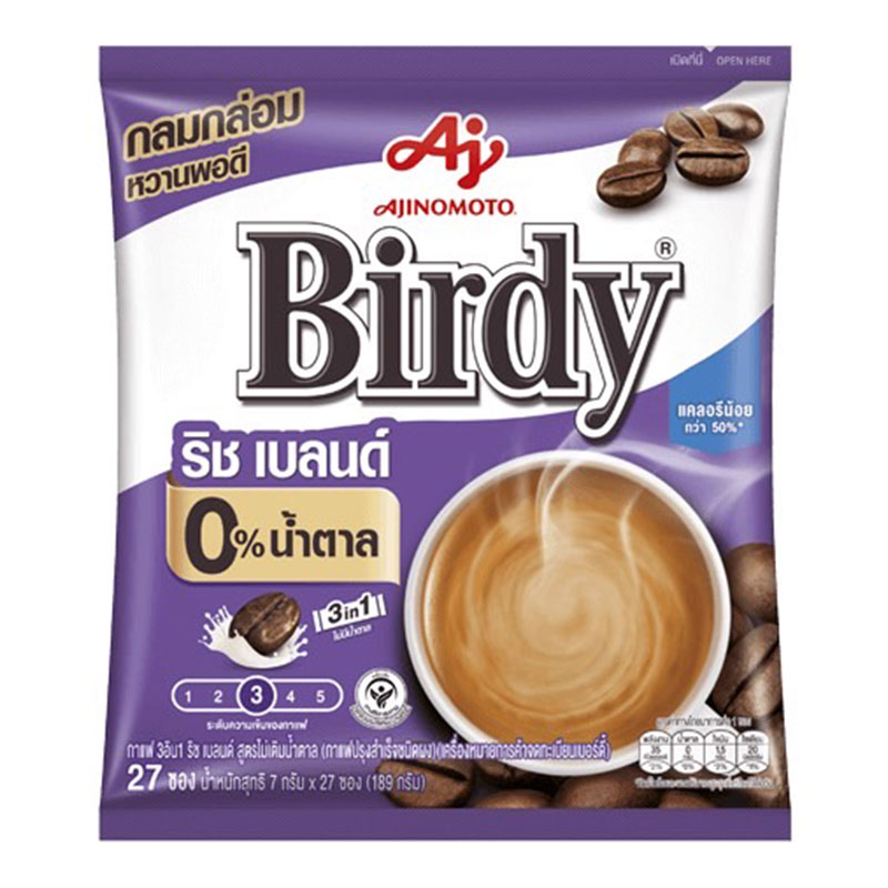 - ชื่อสินค้า: เบอร์ดี้ กาแฟ 3 อิน 1 สูตรไม่น้ำตาล 7 ก. 27 ซอง - แบรนด์: เบอร์ดี้ - ปริมาณบรรจุ: 27 หน่วย ข้อมูลการเก็บรักษา: ควรเก็บในที่แห้งและเย็น