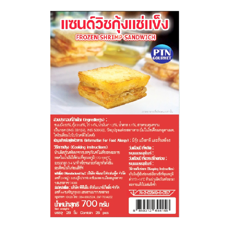 - ชื่อสินค้า: พีทีเอ็น กัวร์เม แซนวิชกุ้งทอดแช่แข็ง 700 ก. - แบรนด์: พีทีเอ็น - ปริมาณบรรจุ: 1 หน่วย