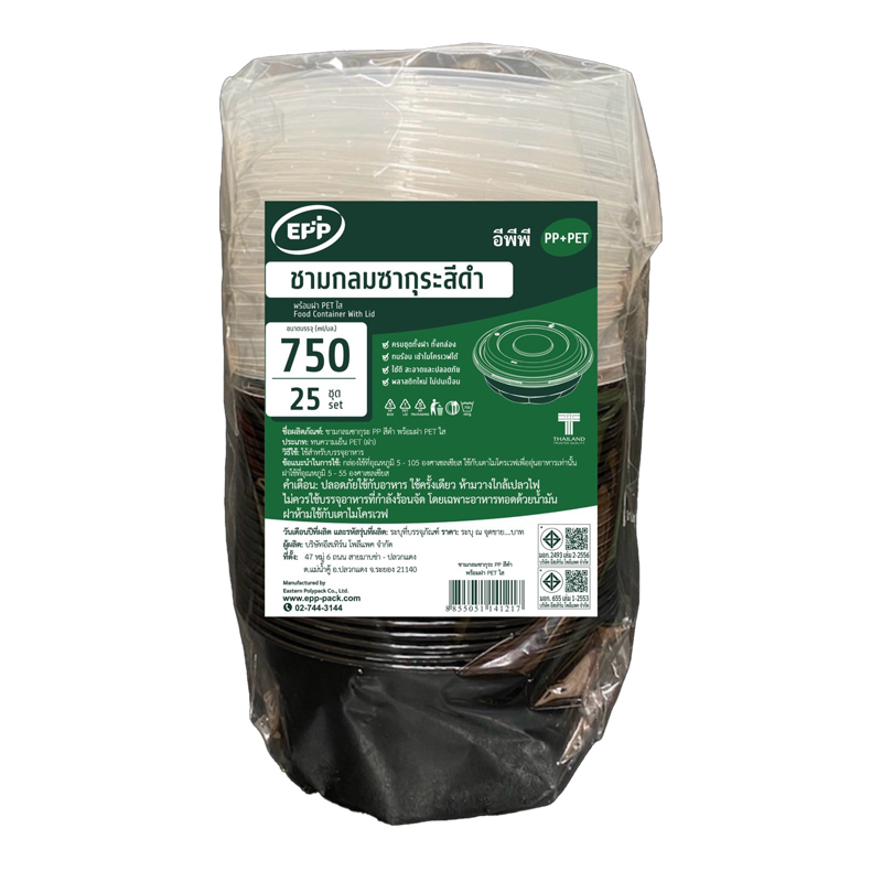 - ชื่อสินค้า: อีพีพี ชามกลมซากุระสีดำ พร้อมฝา PP 25 ชุด - แบรนด์: อีพีพี - ปริมาณบรรจุ: 25 ชุด