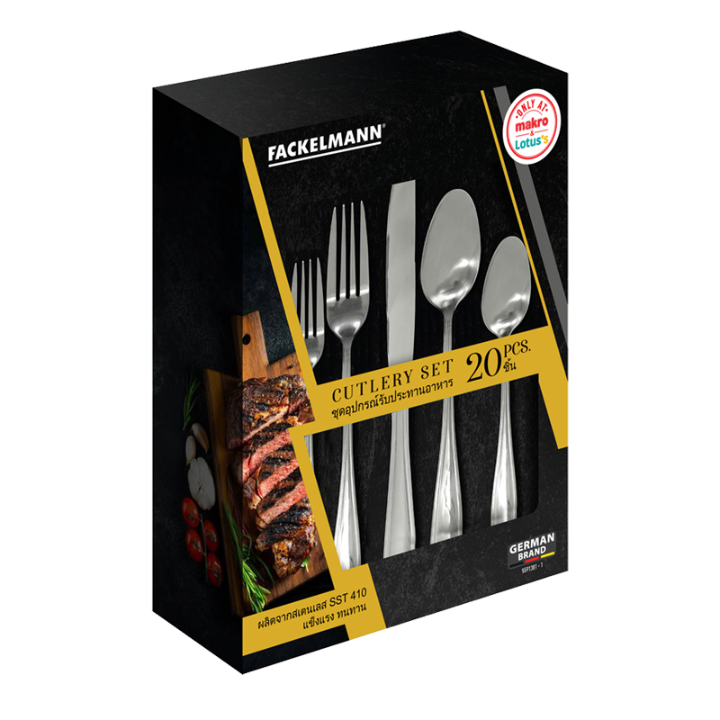 - ชื่อสินค้า: แฟคเคลมาน ชุดช้อนส้อม 20 ชิ้น - แบรนด์: แฟคเคลมาน - ปริมาณบรรจุ: 20 หน่วย