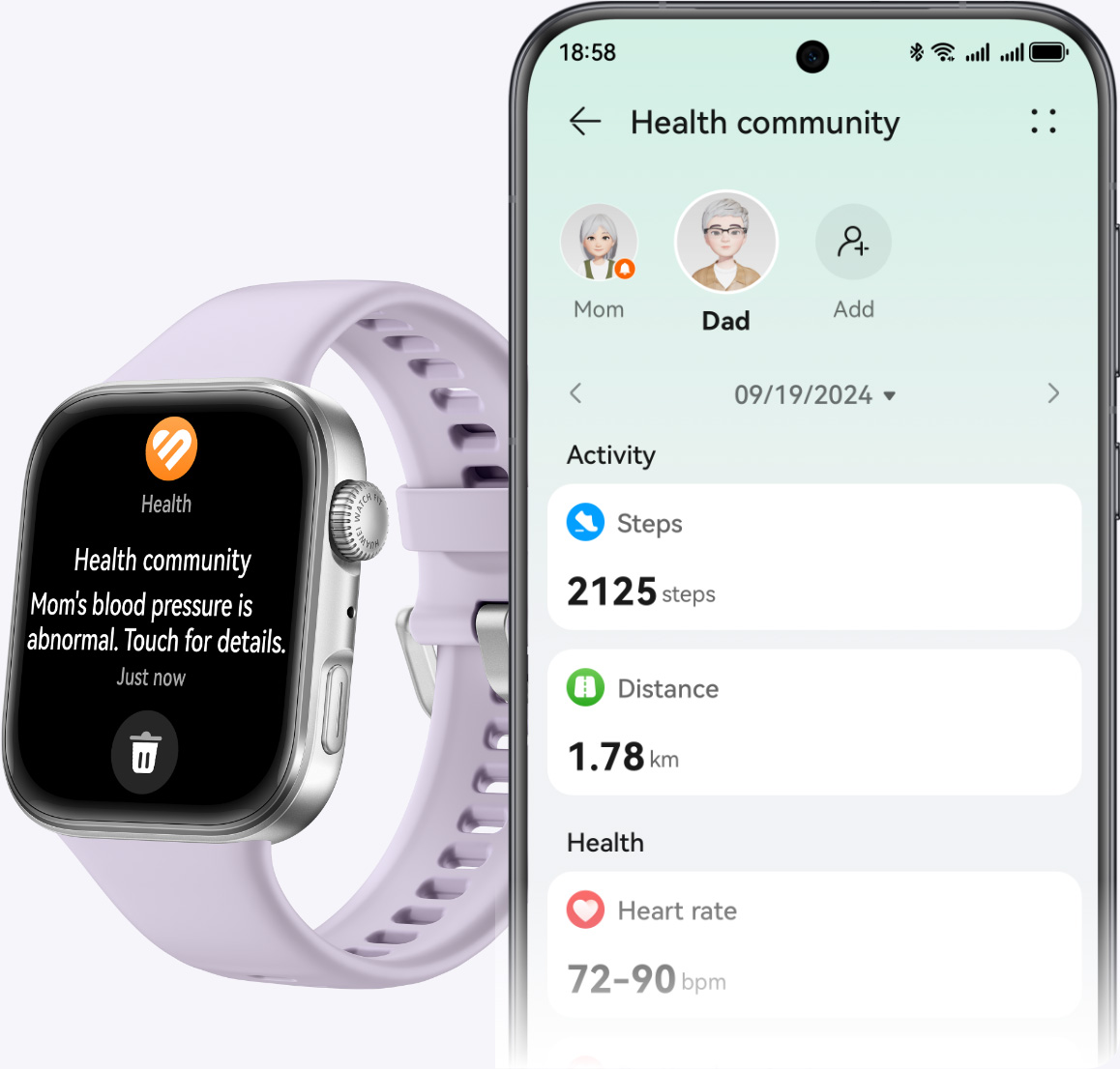 สร้างชุมชนสุขภาพสําหรับคนที่คุณรัก และติดตามอัตราการเต้นของหัวใจ ระดับ SpO2 จํานวนก้าวเดินในแต่ละวัน และคุณภาพการนอนหลับล่าสุดได้จากที่เดียว
